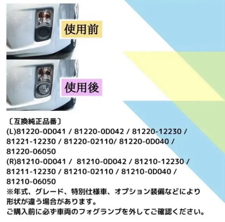 【参考適合車】 C-HR/ZSU60/65 AVU65系 ハリアー /30系 ヴェルファイア アルファー※請確認是否動物毛皮。動物毛皮製品屬於華盛頓條約条約牴觸物品,無法國際運送。 ド ハイブリッド含む/210系 クラウン ※ 210系前期のみ適合 / 70系 ヴォクシー X / TRANS Xのみ /ノア S / Si / V のみ / 80系 前期のみ NOAH VOXY エスクァイア / 50系 エスティマ アエラス 非適合 / 30系 プリウス プリウスPHV / 40系 プリウスα 前期のみ / 130系 マークX / アクア / 20系 WISH ウイッシュ / 150系 オーリス / アイシス / 80系 シエンタ / 90系 ヴィッツ / IQ / 20系 bB / RAV4 / イスト / 40系 カムリ / 30系 ヴァンガード / マークXジオ / ラクティス など ●レクサス CT H23.1~ ZWA10 / レクサス GS H24.1~ GRL10/GWL10 / レクサス HS H21.7~ ANF10 / レクサス IS ハイブリッド H25.5~ AVE30 / レクサス LS600h/LS600hL H19.5~ UVF40 / レクサス NX ハイブリッド H26.7~ AYZ10 〔互換純正品番〕 (L)・81220-0D041 ・81220-0D042 ・81220-12230 ・81221-12230 ・81220-02110 ・81220-0D040 ・81220-06050 (R)・81210-0D041 ・81210-0D042 ・81210-12230 ・81211-12230 ・81210-02110 ・81210-0D040 ・81210-06050 ※年式、グレード、特別仕様車、オプション装備、などによりフォグランプ ユニットの形状が違う場合があります。 ご購入前に必ず取り付け車両のフォグランプ ユニットを外してご確認ください。 ※取扱説明書は付属しておりません。 ※車検に関しては、都道府県・各車検場や検査員などにより異なる場合がございます。 必ずご購入前に最寄の車検場にてご確認ください。 ※商品取付け時・取付け後の、直接・間接の損害については、その責任を一切負いかねます。 ご了承の上、お客様の責任の元、ご使用ください。 >
