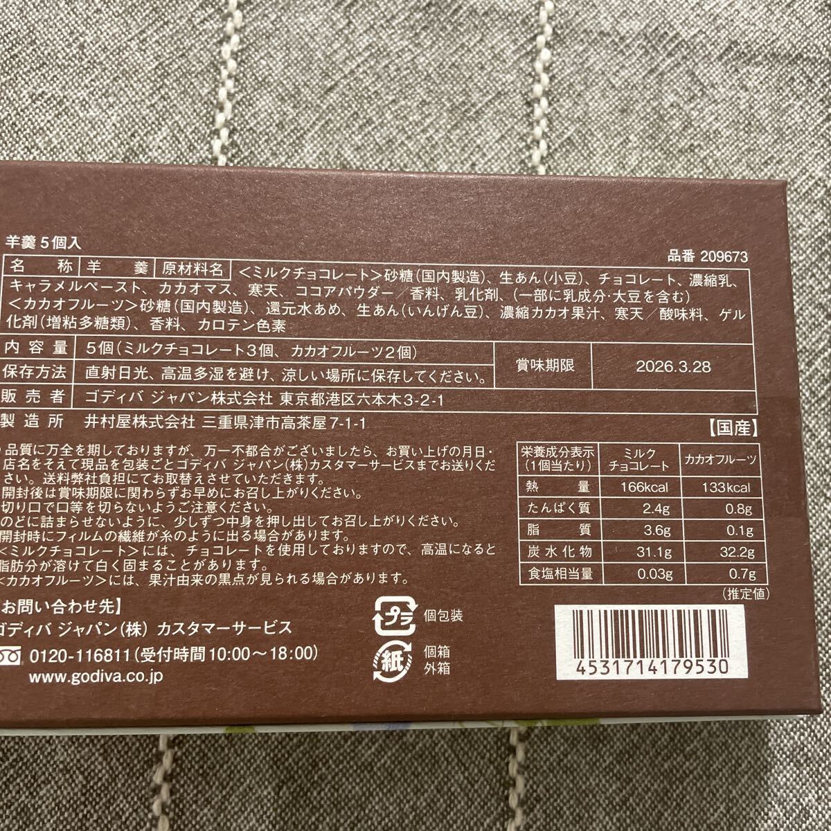 | 商品名稱 : | 新品未開封! GODIVA ゴディバ 羊羹 5個入 期間限定商品 ミルクチョコレート&カカオフルーツ ようかん 和菓子 |