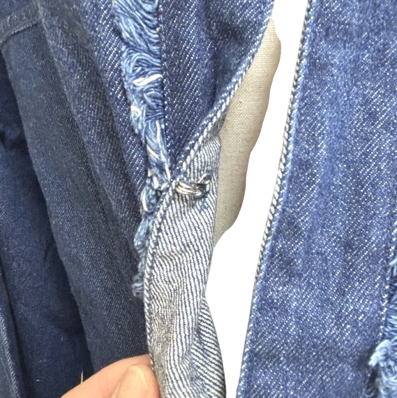 襟元のノーカラーデザインが上品さを際立たせ、デニム素材ながらカジュアルすぎず、