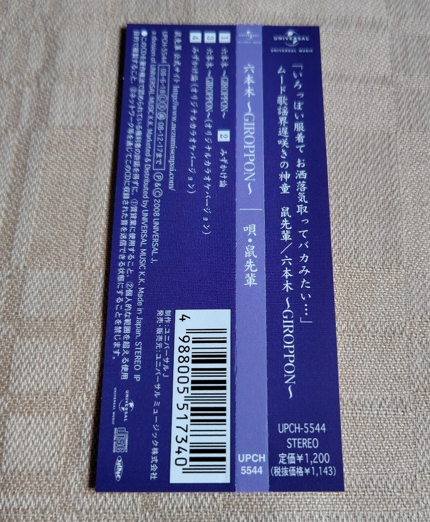 2008年UNIVERSAL MUSIC(UPCH-5544) ●状態● CD、わずかに薄いスリキズあり 再生に異常はありません ジャケット概ね良好です ケースに多少スレあり 帯付き レンタル使用品ではありません ●収録曲● 1. 六本木~GIROPPON 2. みずかけ論 3. 六本木~GIROPPON~ (オリジナルカラオケバージョン) 4. みずかけ論 (オリジナルカラオケバージョン) |