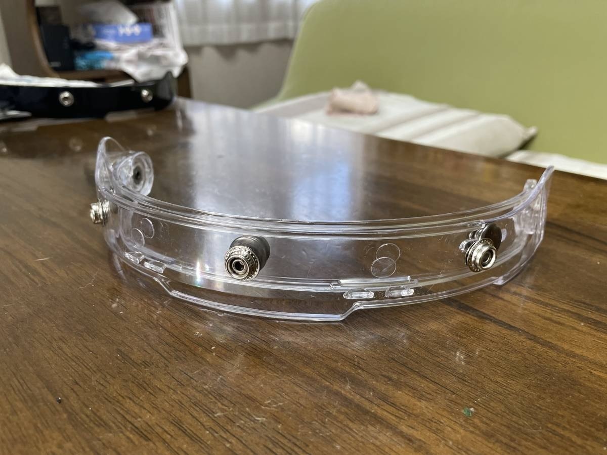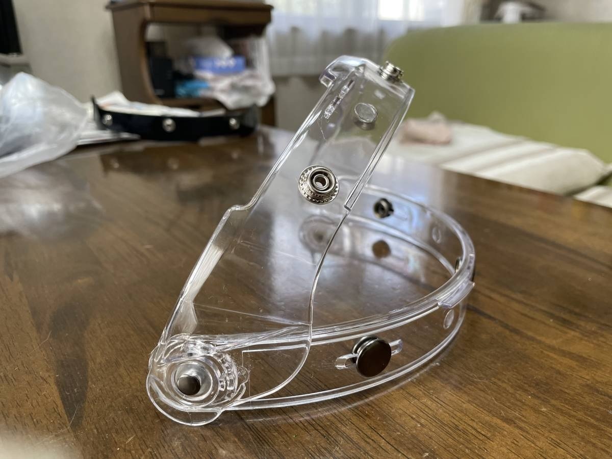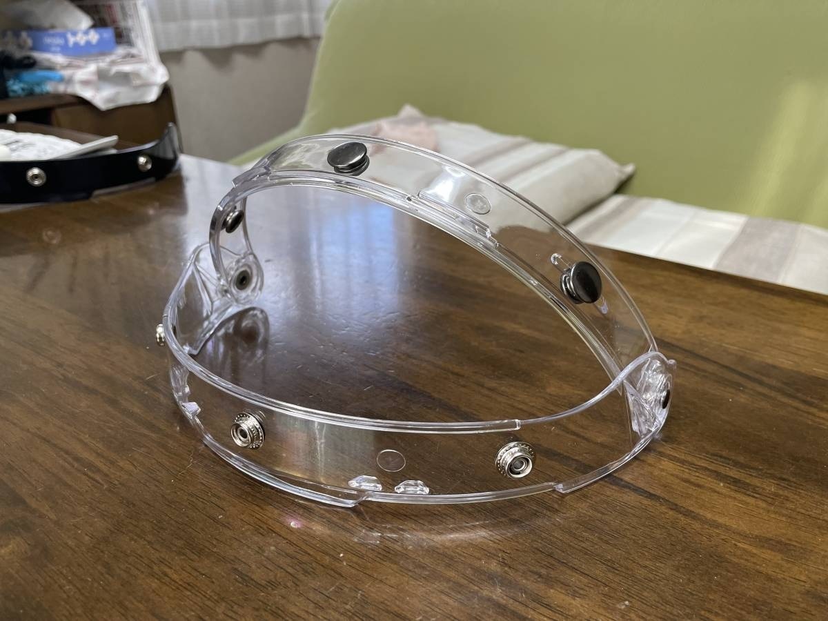 ジェトヘル用3点ホックタイプフリップアップベースクリアーです。 左右のボタンは、それぞれ約 25mm 動きます。