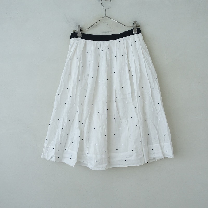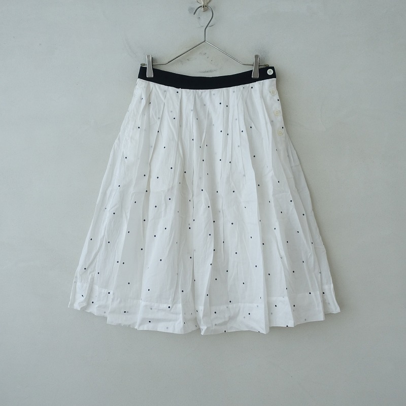 | MARGARET HOWELLのドットプリントコットンタックスカートです。カラーはホワイト×ブラックで、ドットプリントの薄手地で仕立てられており、裏地が付いております。ウエスト周りにタック入りで左腰のボタン開閉で着脱でき、両サイドにシームポケットが付いております。 |