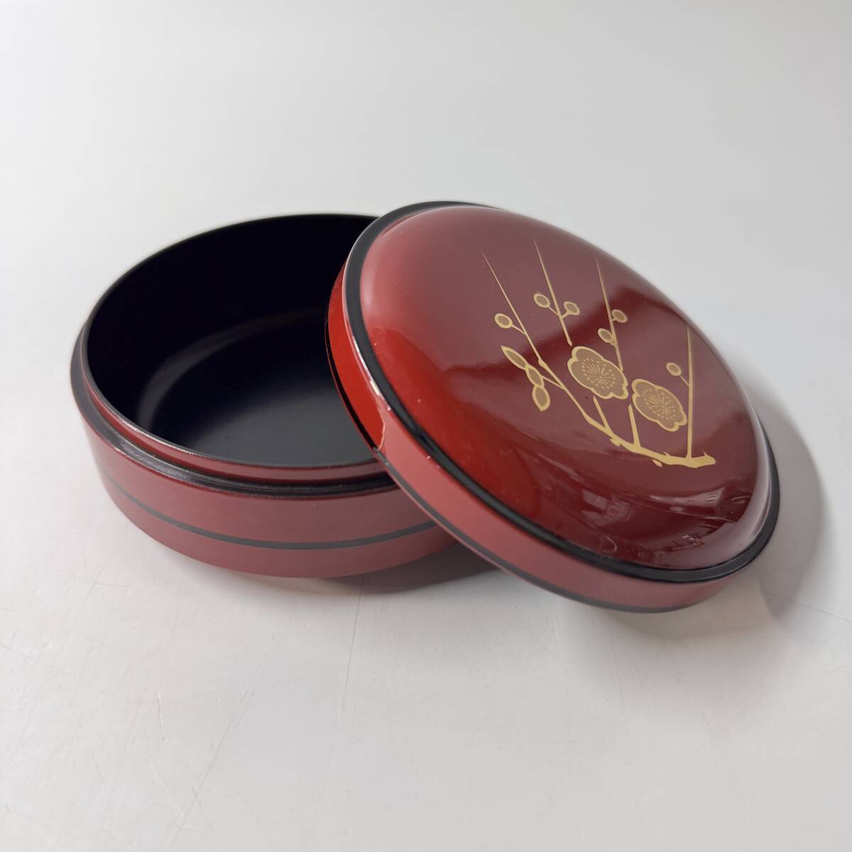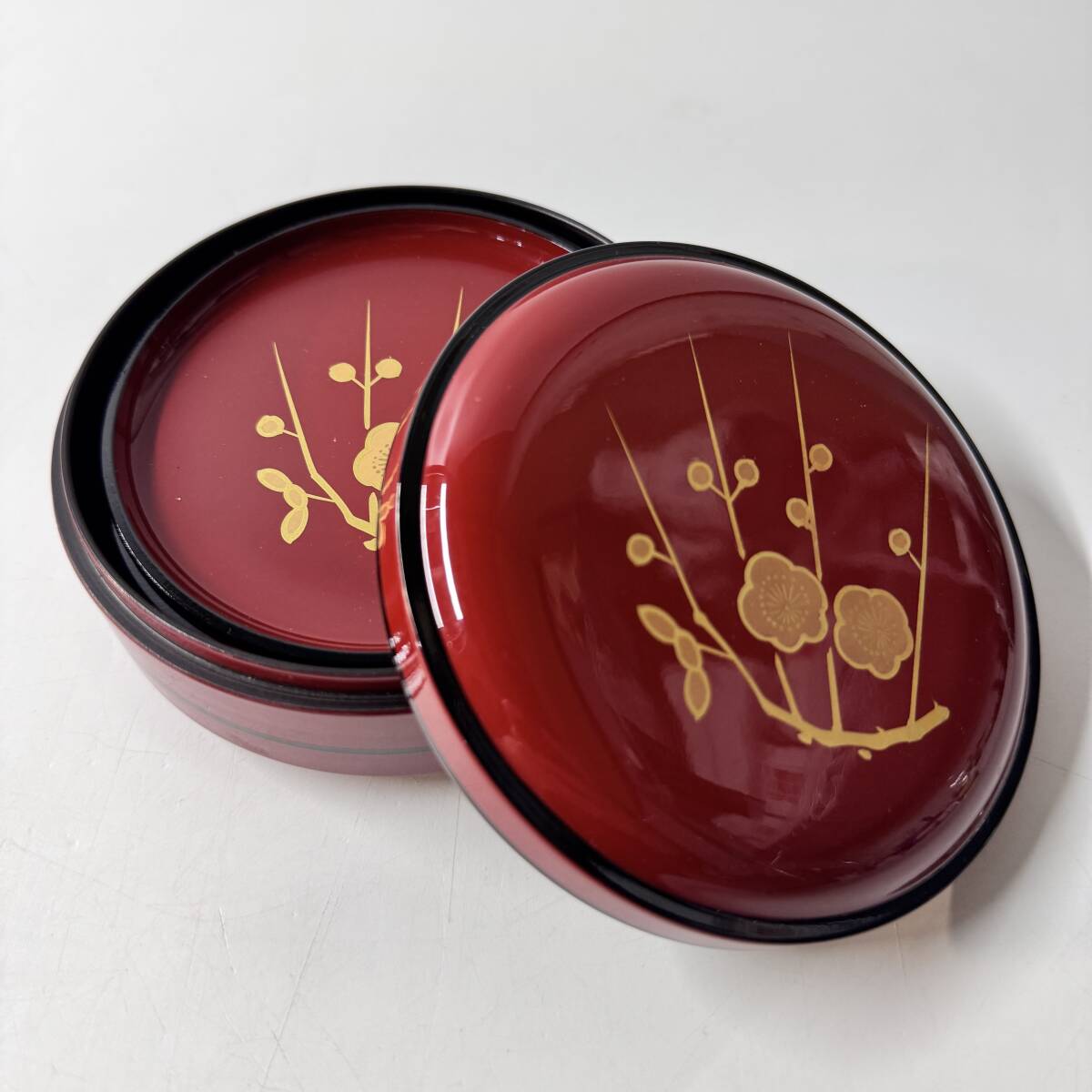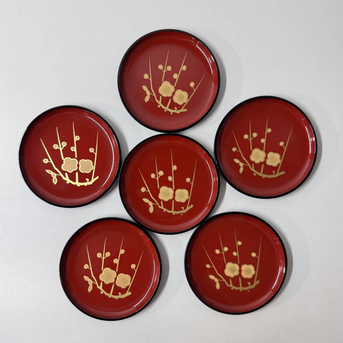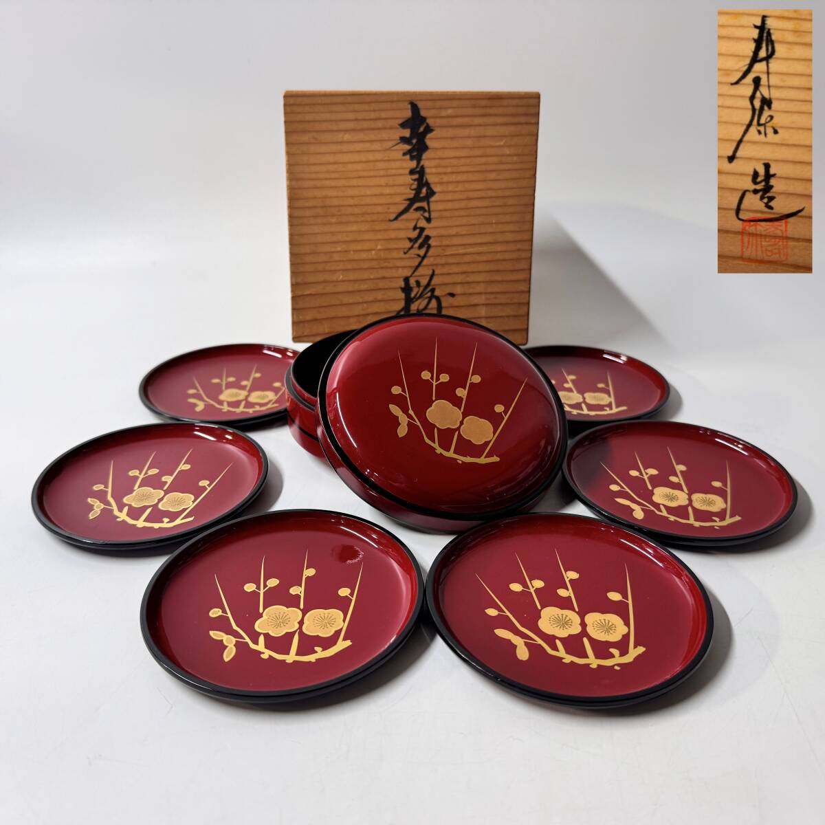 未使用 幸寿多揃 産地工房作家名不詳 漆芸漆器 金蒔絵 枝梅 草花文 蓋物入 茶托 銘々皿 共箱 茶道具 経年保管品 現状品故障品、問題商品、可能無法修理,請注意の出品です。