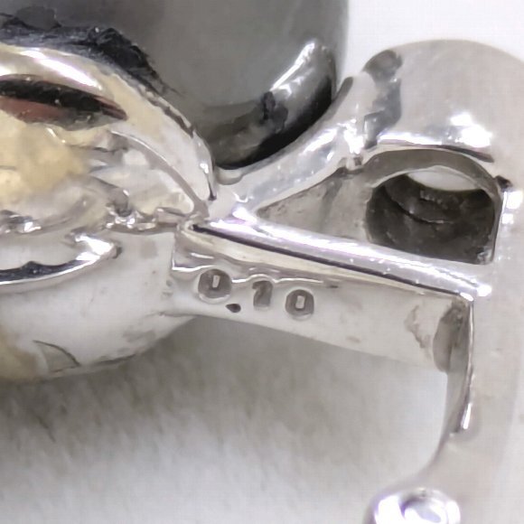 南洋黒蝶真珠 / タヒチパールを 14金ホワイトゴールドの枠にセットされており 合計 2ピース 0.2カラットの天然ダイヤモンドが石留めされています。タヒチパールのサイズは、最大約10.4ミリございます。お色は、主観になりますが 濃いグレー色を基調に薄っすらとグリーンやレッドのお色が見れます。タヒチパールは目立った擦れキズはございません。数ヵ所のエクボが確認できますが 大変綺麗です。イヤリング金具は使用感によるメッキの剥がれが確認できます。ダイヤモンドのクラリティは、主観になりますが SIクラスになると思います。 |