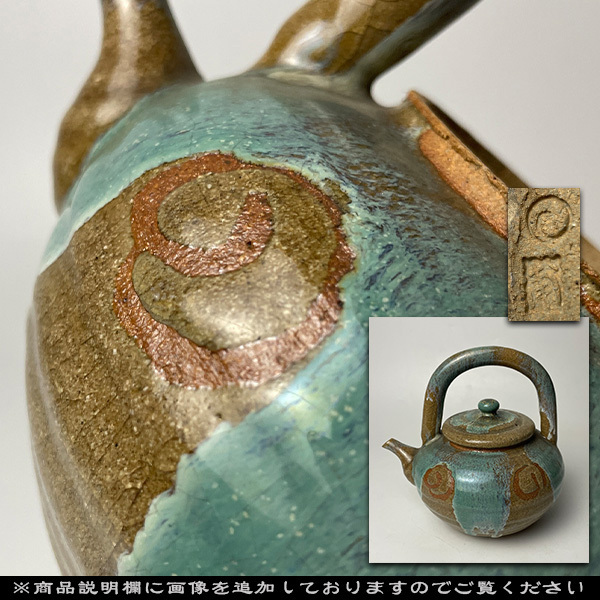 多数の骨董品などを出品中(クリック) 上野焼 時代 青緑釉急須 緑釉水注 在銘 甫印有 花入 古上野焼