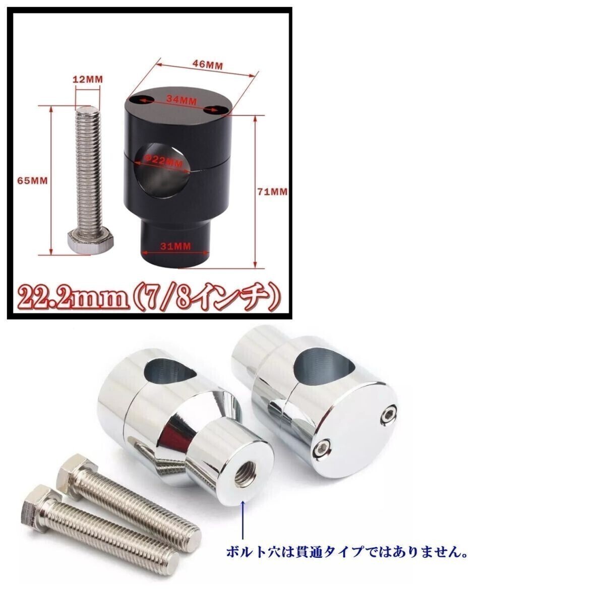 ご覧いただきありがとうございます。 【発送方法】 日本郵便レターパックプラス(速達扱い) (1-2営業日以内に奈良県から出荷致します。) 【サイズ/カラー】 22.2mm径/メッキ ハンドルポスト×2(左右分) ボルト×2(左右分) 【内容/材質】 製品の材質:ビレットアルミ 製品重量:約550グラム 【寸法】 7/8インチハンドルバー用(約22.2mm)となります。 本体全長:約71mm(詳しい長さは画像参照) 付属ボルト:M12径 長さ約65mm 【梱包】 商品をプチプチ包装し、段ボール小箱に封入後 レターパック封筒に封入させていただいております。 ■商品についての詳細仕様書・説明書は付属しておりません。 ■全品、1個ずつ日本国内で検品の上、日本のスタッフが包装を行っておりますが 輸入品のため、使用に支障の無いスレがある場合がございます。 できる限り磨いて綺麗にして包装させていただいております。 ■入荷ロットにより、ボルトが貫通する形状とそうでない形状がございます。 ■車両名の記載が有る場合でも汎用品ですので、車種により取付可否と取付時の加工内容が異なります。 ■ご購入前に現車の形状確認をお願い致します。 ■取付が不十分の場合、大変危険ですので有資格者による取付または自己責任にてお願い申し上げます。 ■いかなる場合も工賃および車両の部品代などの請求には応じることはできません。 ■社外の汎用部品につき、多少の加工を要する場合がございます。 取り付け車両のボルトが通る穴が、当商品のボルト径より小さい場合は、基本的に穴を拡張する必要があります。 ■作業などショップ様にご依頼する場合は、予めショップの方と商品詳細をご確認後にご購入ください。 |