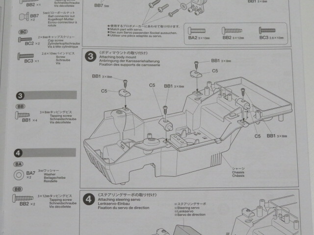 ボディパーツ、ステッカー、必要なネジ(ビス袋詰B BB1×16本、BB2×2本)があります。