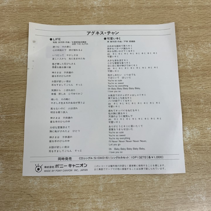 | 商品名稱 : | ●01)【1点限り!】【見本盤】アグネス・チャン/Life/可愛いキミ/EPレコード/7インチ/国内盤/7A0891/A |