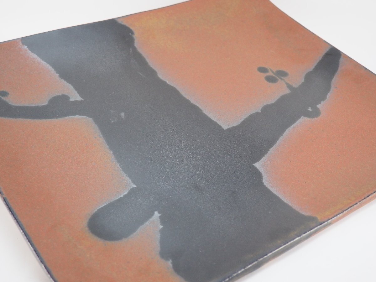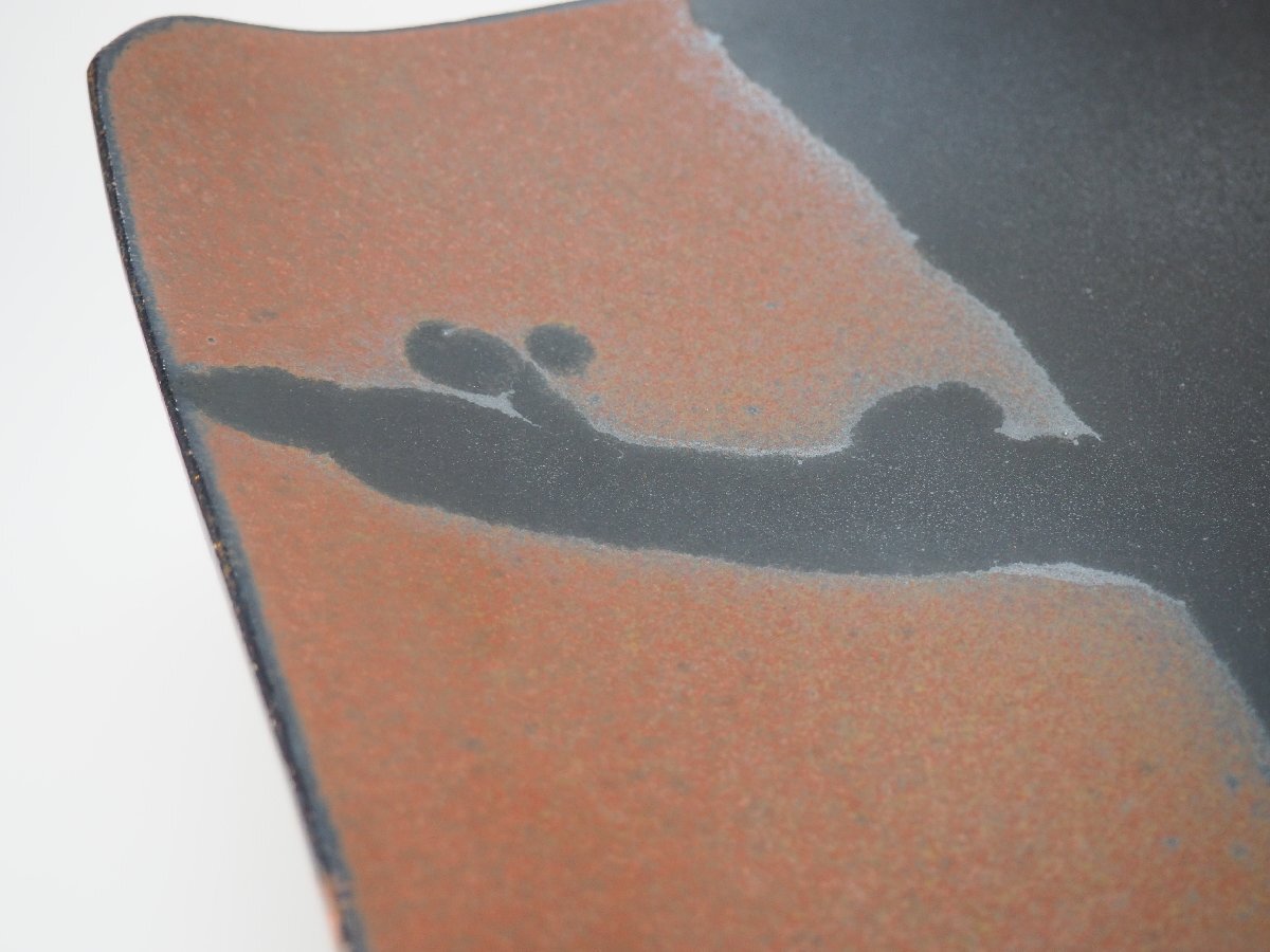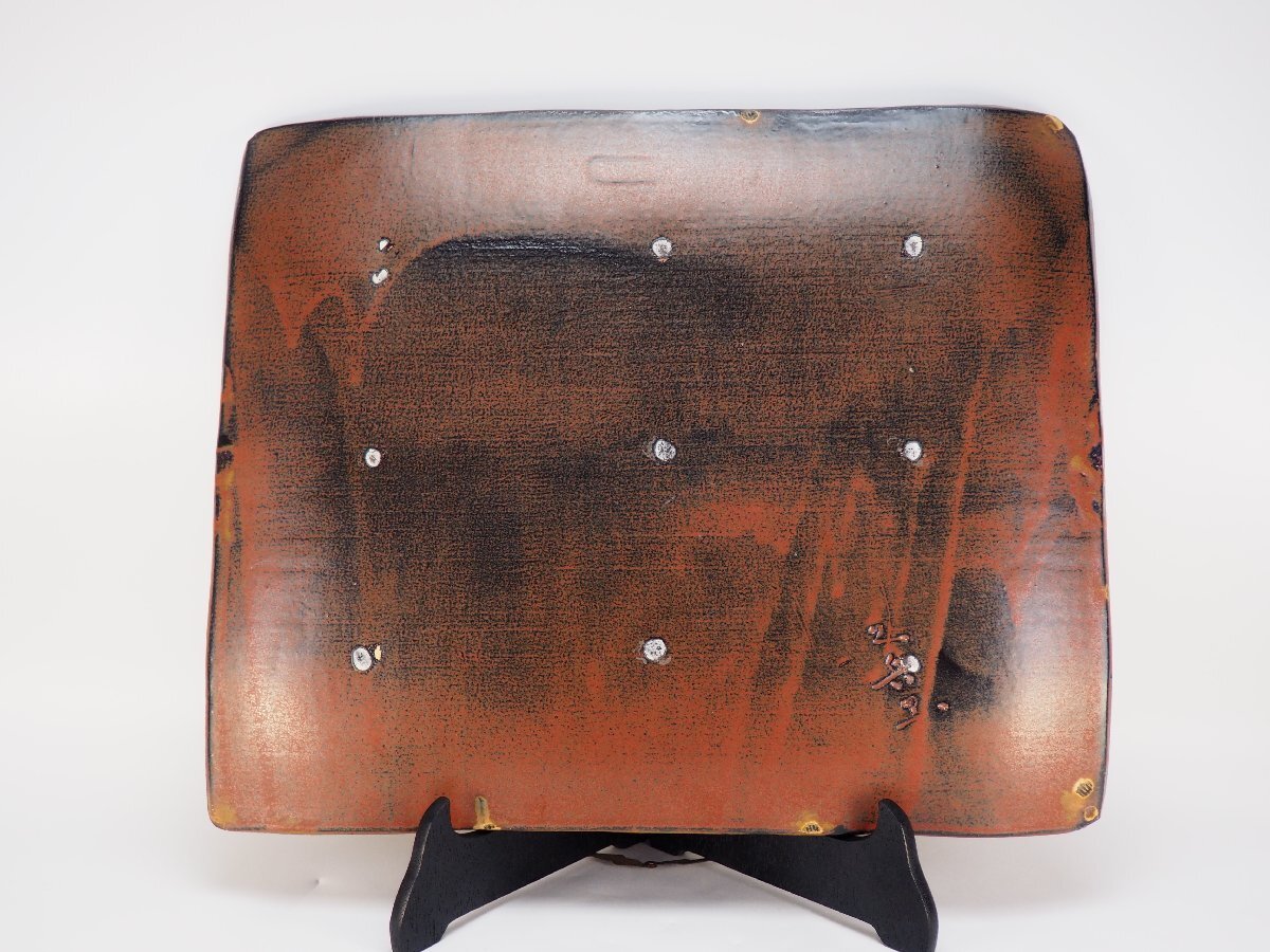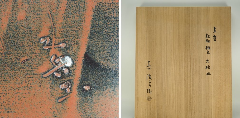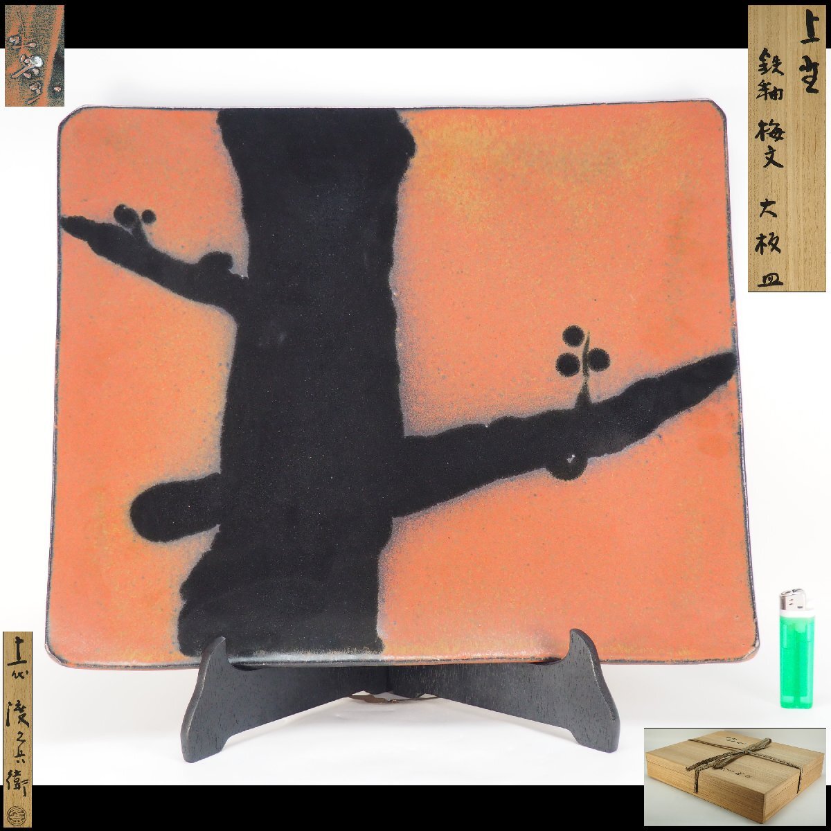 坂倉新兵衛弟子『渡久兵衛』作。見事な上野焼鉄釉梅文大板です。共箱付き。無傷・本物保証品。画像に掲載されてない、かつ説明文に明記されていない痛みや傷があった際は必ず誠実に対応致します。古い物が中心ですので画像にての入念な御確認の方も宜しく御願い致します。