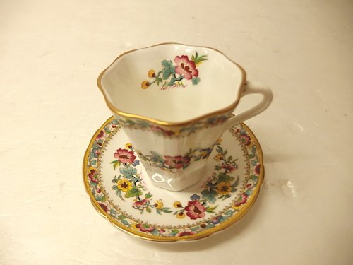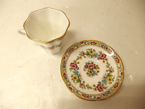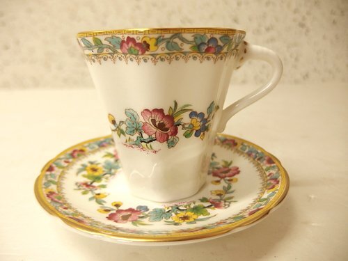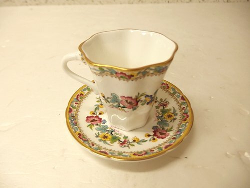 イギリスの名窯 COALPORT(コールポート) のデミタスカップ&ソーサー「Ming Rose」です。 クラシカルな八角形フォルムに、華やかな花柄があしらわれた上品なデザイン。 ボーンチャイナ特有の透けるような白磁が美しく、コレクションやティータイムのアクセントにもおすすめです。 【サイズ】 カップ 口径:約7.3×7cm 高さ:約7cm ソーサー 直径:約11.5×高さ1.7cm 【商品状態】 ・中古品 ・全体に汚れやスレが見られます。 ・金彩にスレやくすみがあり、カップ縁は一部剥がれがあります。 ※中古品のため状態にご理解のうえご検討ください。