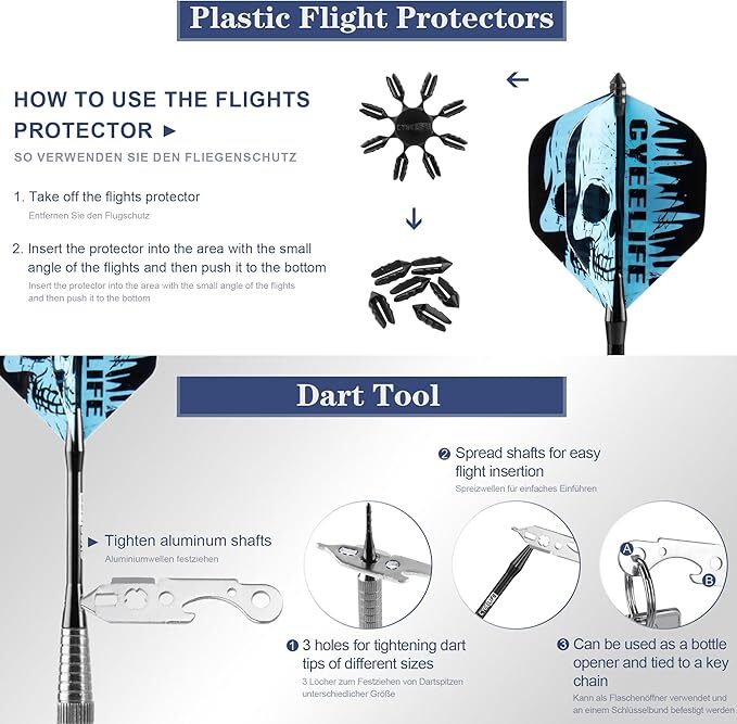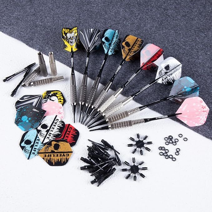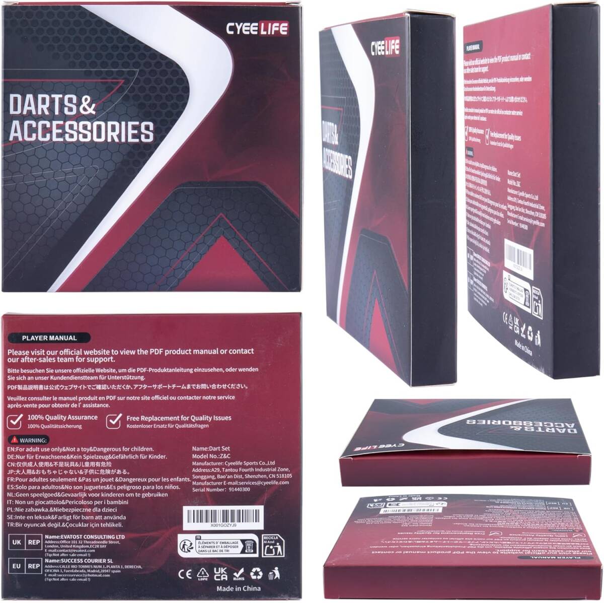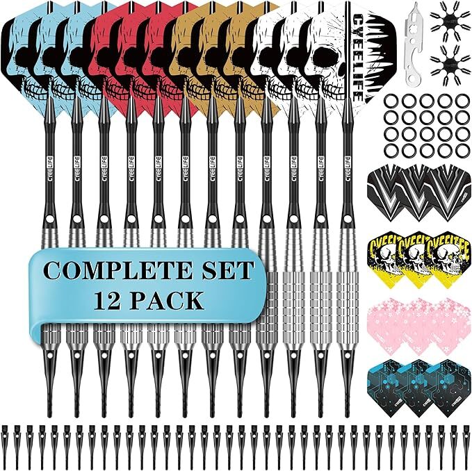 12本のフルセット - CyeeLifeソフトダーツセット内容: ソフトダーツ矢12本(2色×6本)、アルミニウムシャフト12本、フライト24枚(8デザイン)、プラスチック製先端50個、Oリング20個、フライトプロテクター2個+ダーツ工具1個!