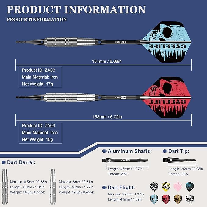 CyeeLife プラスチック製先端ダート(ダーツ)矢、12本セット 電子ダーツボード用ソフトダーツ矢、15/17グラム プロ仕様ソフトダーツ 1029
