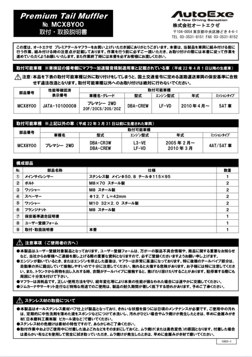 | 商品名稱 : | マツダ MAZDA プレマシー AutoExe オートエグゼ MCX8Y00 DBA-CR3W DBA-CREW 2WD ステンレスマフラー 社外マフラー USDM |