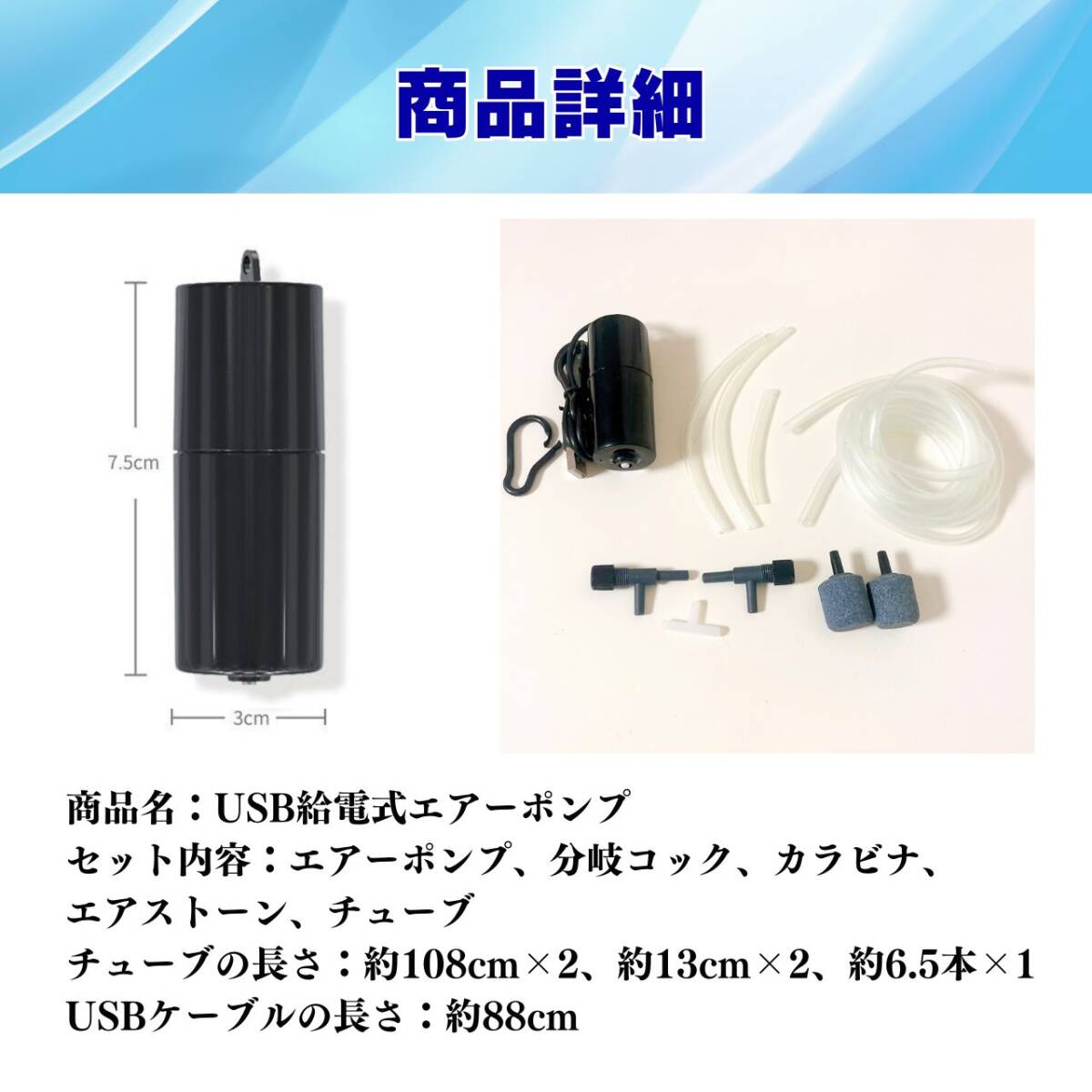 携帯可能な小型のUSB給電式のエアーポンプ。 エアレーションを行うことで水槽内の魚や水生植物に酸素供給を行い、水中の循環を向上させます。 USBケーブルで簡単に給電ができるので、USBポート、モバイルバッテリ國際運送規定電池為危險物品,無法運送,購買後會幫您取出丟棄。 ー、シガーソケットなどに繋ぐことで、 屋外屋内の両方で使うことができ、エアーポンプを使用して、釣った魚を生きたまま持ち帰ることができます。 クーラーボックス、いけす、バケツ、アクアリウム、魚釣り、生き餌の運搬などさまざまな場面で使用できます。 ※充電式ではありませんので、ご注意ください。 静音設計で水槽内の静寂を損ないません。夜間も快適にご使用いただけます。 また、コンパクトなデザインで、水槽のレイアウトを損ないません。透明な素材を使用し、視覚的にも美しく、水槽内のデコレーションと調和します。 USBコード付きなので、届いたらすぐに使用することができます。 持ち運びに便利なカラビナ付き。 商品名:USB給電式エアーポンプ セット内容:エアーポンプ、分岐コック、カラビナ、 エアストーン、チューブ チューブの長さ:約108cm×2、約13cm×2、約6.5cm×1 USBケーブルの長さ:約88cm ※検品には万全を期しておりますが輸送時の衝撃などでストーンの砂が多少取れる場合がございます。 また、本体などに小さな傷を認める場合がございますが、使用に問題がない場合は初期不良に該当致しませんのでご了承ください。 ※エアーチューブはお届けの際、潰れていることがございますが、使用しているうちにまた徐々に戻ってきます。 ※取り扱い説明書は付属しておりません。 エアーポンプ エアポンプ USB 2分岐 ポータブル エアストーン エアーストーン エアチューブ ブクブク 釣り 水槽 魚 酸素 アクアリウム