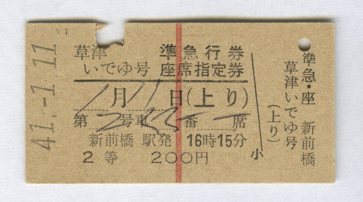 | 国鉄 常備券 「草津いでゆ」 準急行券・座席指定券 2等 新前橋発 昭和41年 | |