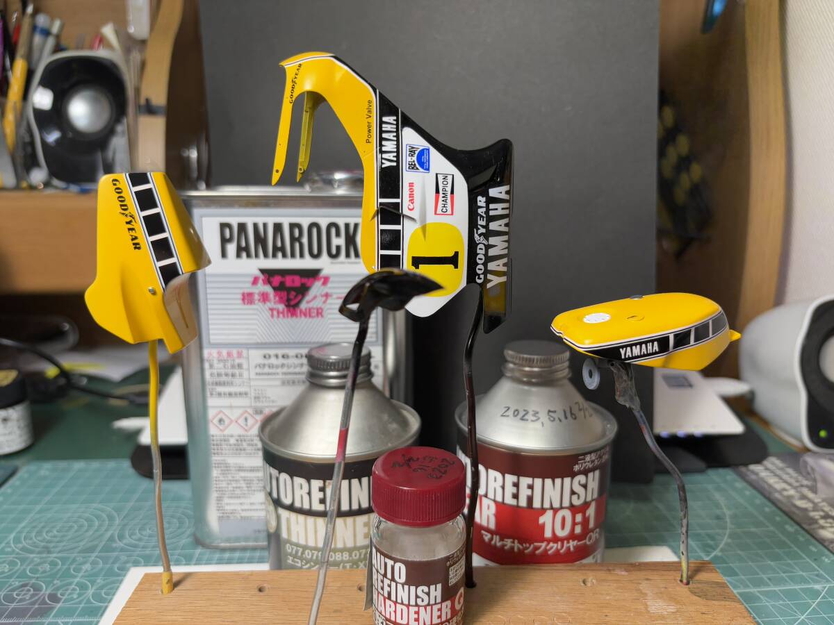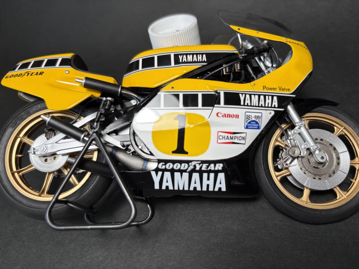| ★商品説明★ | ★タミヤ 1/12 ヤマハYZR500 ケニー・ロバーツ グランプリレーサー 1980 完成品です。 ★金型が古いため、カウルや各パーツを実車に近づけるべく、サンディングを繰り返し、合わせ目消しと整形をしています。 ★キット付属デカールは古くて傷んでいたため使用できませんでしたので、アフターパーツのカルトグラフ製デカールを別途購入して使用しています。 ★スクリーン取付、カウルの一部リベットは金属に交換。 ★エアブラシでイエロー、ブラック、ホワイト塗り分け塗装、デカール貼り付け後、実車用2液混合式ウレタンクリアーコート仕上げ。 ★研出し(ペーパー1000~3000)後→3Mコンパウンド3種類→セラミックコンパウンド。綺麗な艶が出ています。 ★スタンドは転倒、脱落防止のため、クリアーボンドで固定しています。 | |