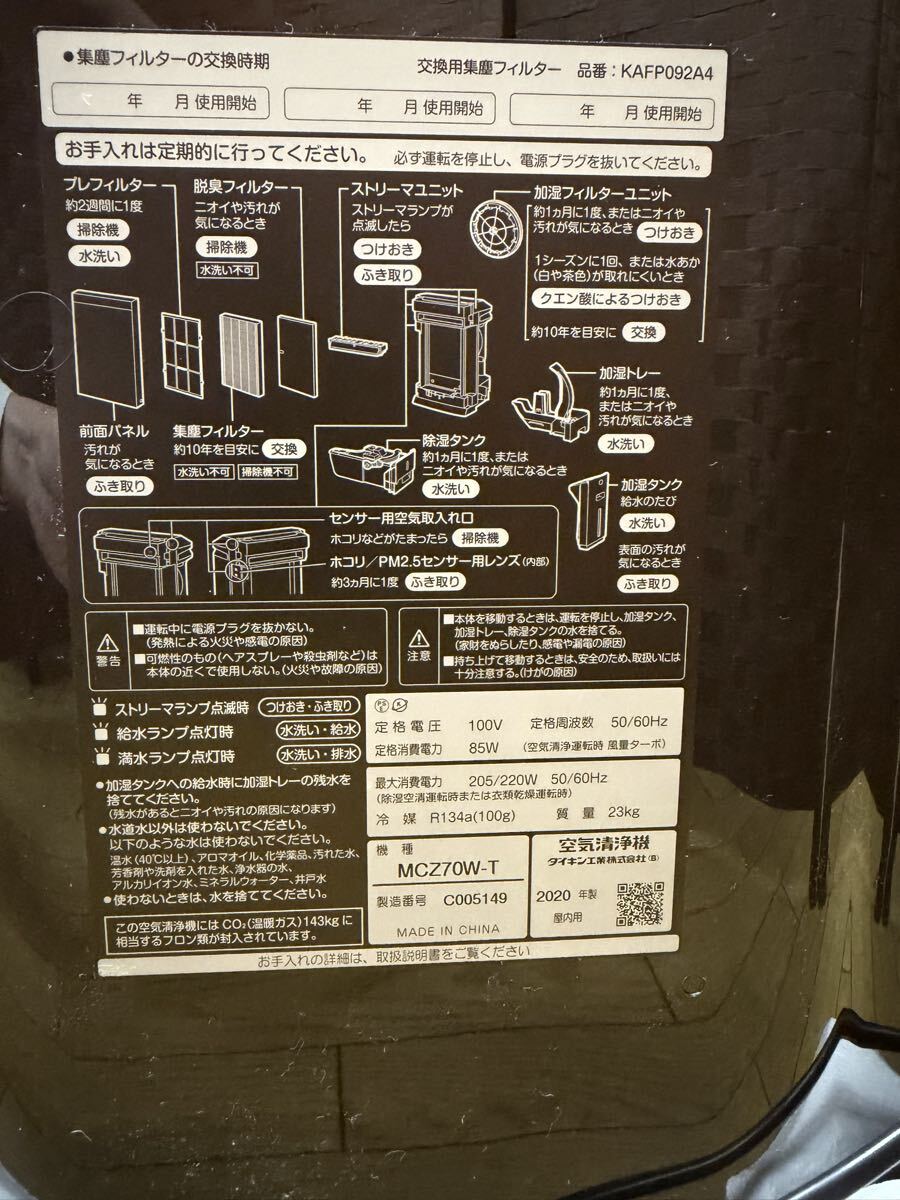 【開封のみ未使用】ダイキン MCZ70WE-T ストリーマ空気清浄機 加湿・除湿一体型 2020年製 定価約10万円 高性能モデル 送料込み