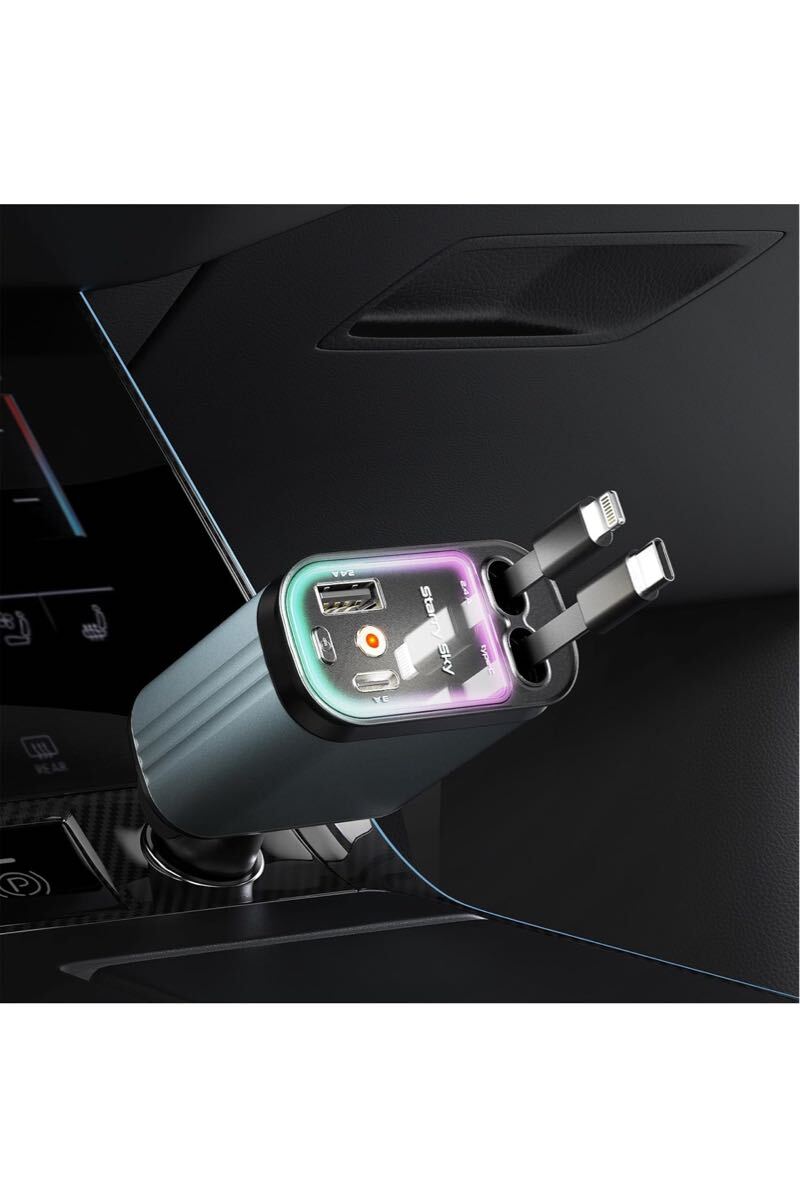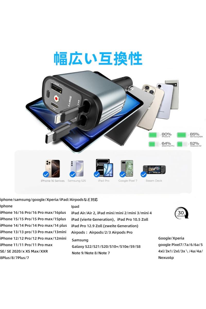 【4機器同時充電対応】USBポート2基と巻き取り式ケーブル2本を装備し、最大4台のデバイス同時充電が可能。家族旅行時の電子機器充電に最適なだけでなく、車所有の方への贈り物としても最適です。Android/iOSシステムに対応し、iPhone 16 Pro MaxなどのType-Cデバイス高速充電を実現し、従来にない車載充電ソリューションを提供します。