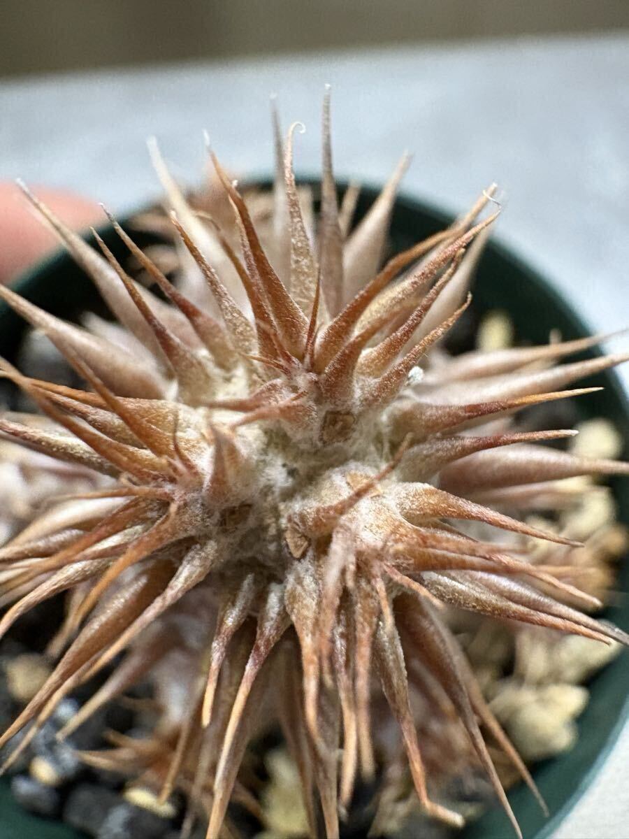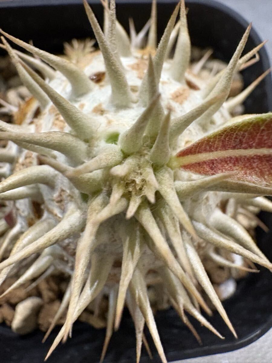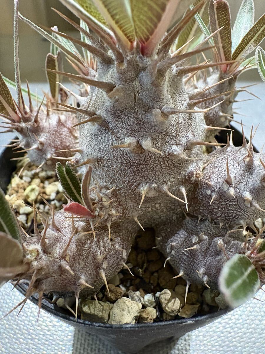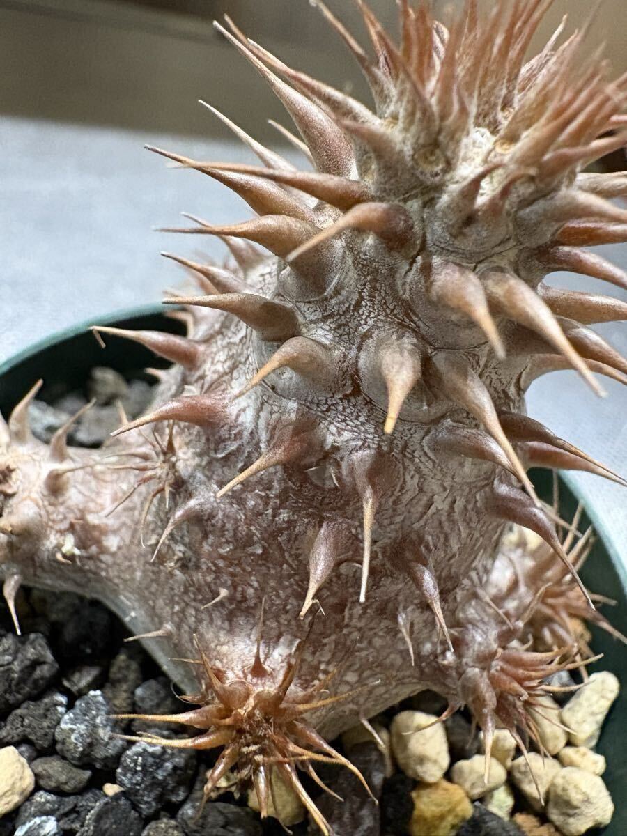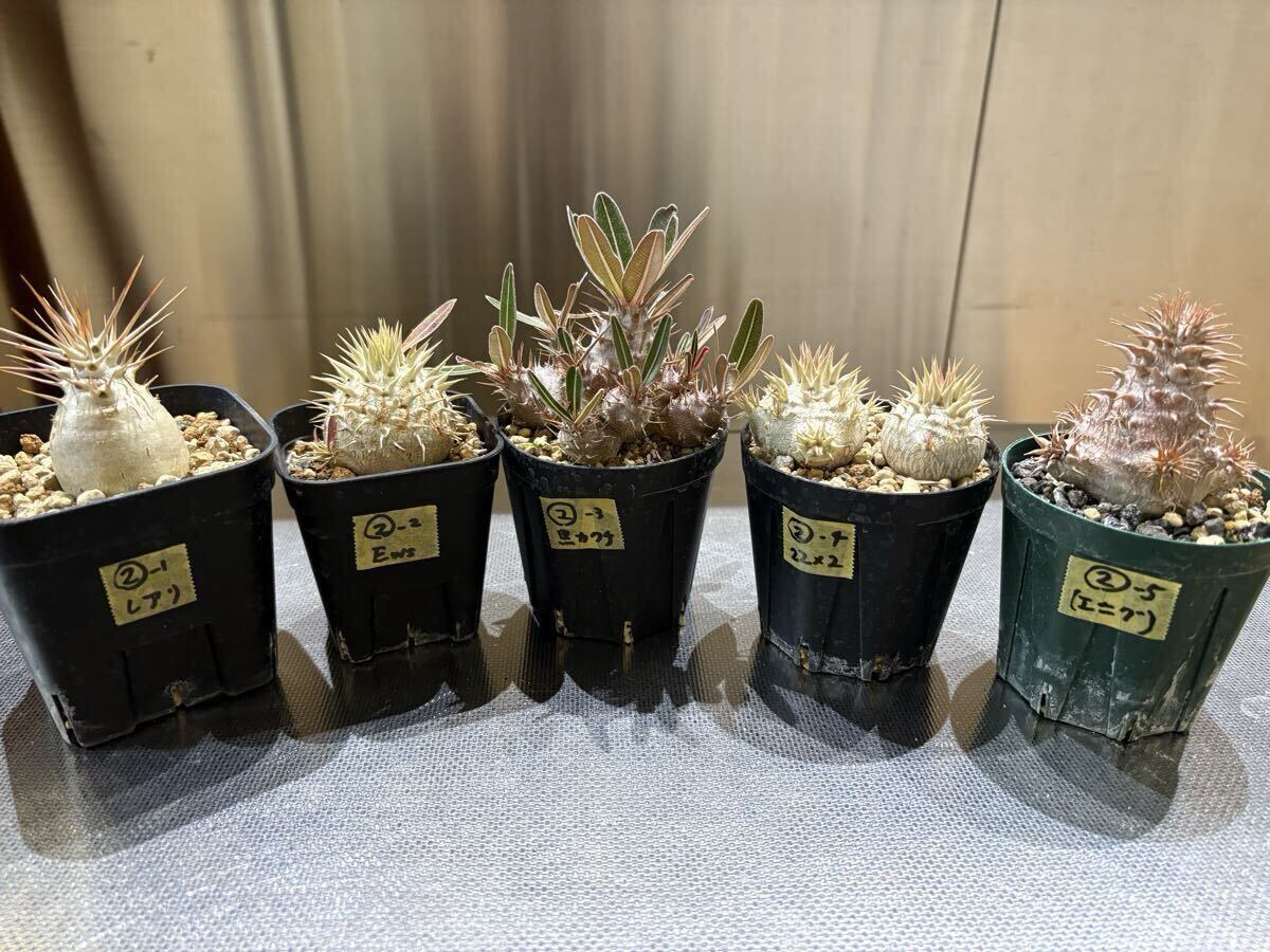 朝晩が冷えてきてカクチペス以外落葉済みですが元気に生きています!上手く休眠できていると思います! 写真と到着時と葉っぱの感じが異なっていると思います根っこはパンパンなので元気ですのでご安心ください。 今は逆に発送しやすい時期でもあります! --- ◎78オリジナルハイブリッドのパキポディウムを含む豪華セットです! ・022番ハイブリッド(78hyb-022) 1歳半 78オリジナル「78魔界大黒」と呼んでいます。 私の定義としてロスラ系とブレビ系(一部扁平大黒も含む)のミックスを大黒としております。これは私の私見ですのでご容赦ください。何より、ボディーや葉や花の面白さを楽しむためのミックスです。こちら022系は未開花なので来季の開花が楽しみでなりません。ボディーは丸〜扁平〜生姜型と様々で可愛いです。 花粉親:実生丸葉マカイエンセ(両親山木、山木っぽい丸葉形質、dob氏産) 種子親:実生レウコキサンツム(両親山木、真四角の綺麗な形、鷲氏産) 両親の出所は信頼のおけるビッグネームなので,安心素材です。きっちり管理されていますので変な血が入っていることはないと思われます。 丸型スリット鉢75 ---- 以下は、信頼おける大先輩の趣味屋さんから譲って頂いた種子からの自家実生株もしくは導入実生株です。 ・白エブ(suzu産)1.5歳 今回の株は写真でも分かるように、軽く木化しています。焼けているわけではなく、何株かこういう面白い姿をしています。将来どう変化するか見ものです! 花粉親:実生白花エブレネウム(6花弁も咲くらしい) 種子親:実生白花エブレネウム(大きめ丸花) 未開花なので花色花型は不明 プラステラ75 ・レアリー(buk産) 1歳弱 レアリー播種に初挑戦した株第一号リリースです!非常に成長が早く,そそくさと落葉しました。確実に生きていますのでご安心ください。1歳弱でこの大きさ(径2.5cm以上、鉢はプラステラ90)は驚異的です。徒長もなく綺麗に育っています。トゲが長いのでご注意ください! プラステラ90 ・カクチペス(seedstock産)1.5歳 下腹部ぽってりで、多頭の美しい黒肌のカクチペスです。カクチペスらしくまだまだ葉を落とす気はなさそうです。 丸型スリット75 (オマケ) ヤフオクで購入したエニグマチカムのタネを当方で実生しました。しかし、風体から推測するにエニグマチカムでもないと思います。いろいろな形状の子が生まれましたが、それらしい葉型をした物も散見されるので、交雑したのかなと思われます。 という事でパキポディウムsp.(不明種)とし、オマケ程度に考えてください。同じタネを購入した知り合いの報告では、一つ開花した物がホロンベンセ花だと言うことですので,咲いてみてのお楽しみということで! 播種後三年、黒肌ですのでカッコよく育ちそうです!大変成長が遅く詰まって育っています!さてさてどんな花を咲かせるか!? 丸型スリット75 (おまけ) 今季採種したパキポディウムハイブリッドもしくは純系の種子を5粒お付けします!選んでいただくことはできませんが、精魂込めて色々考えて作った面白いハイブリッドです。播種設備がない方もおられますので、必要な方は「オマケの種子希望!」と最初のメッセージで記載して下さい。 同日終了予定のほか出品物と同梱ももちろん可能です。即決で早くご落札いただいても、終了まではお取り置きしますので仰って下さい!同梱の場合梱包サイズが変わることがございます。ご落札後追ってお知らせします! (重要) 60サイズ発送の予定ですが、上手く入る60サイズの段ボールがありませんので自分で段ボールサイズを調整しています。背の高さによっては少し葉が天井に付いた状態で発送する場合もございます。特に悪影響がないと思われる程度ですが、お気になさる方は、80サイズで発送しますので最初におっしゃって下さい! 出来れば作業の統一と窓口やレジでの煩雑さ解消のため、クロネコでの発送を選択していただけますと助かります! 気持ちの良いお取引を心がけております! 落札者様におかれましてもよろしくお願い申し上げます。 生体ですので速やかにお受け取りいただけるようお願いします。季節の変わり目なので輸送中に葉が落ちる可能性もありますが、普通のことです。ノークレイムノー返品でお願いいたします。 >