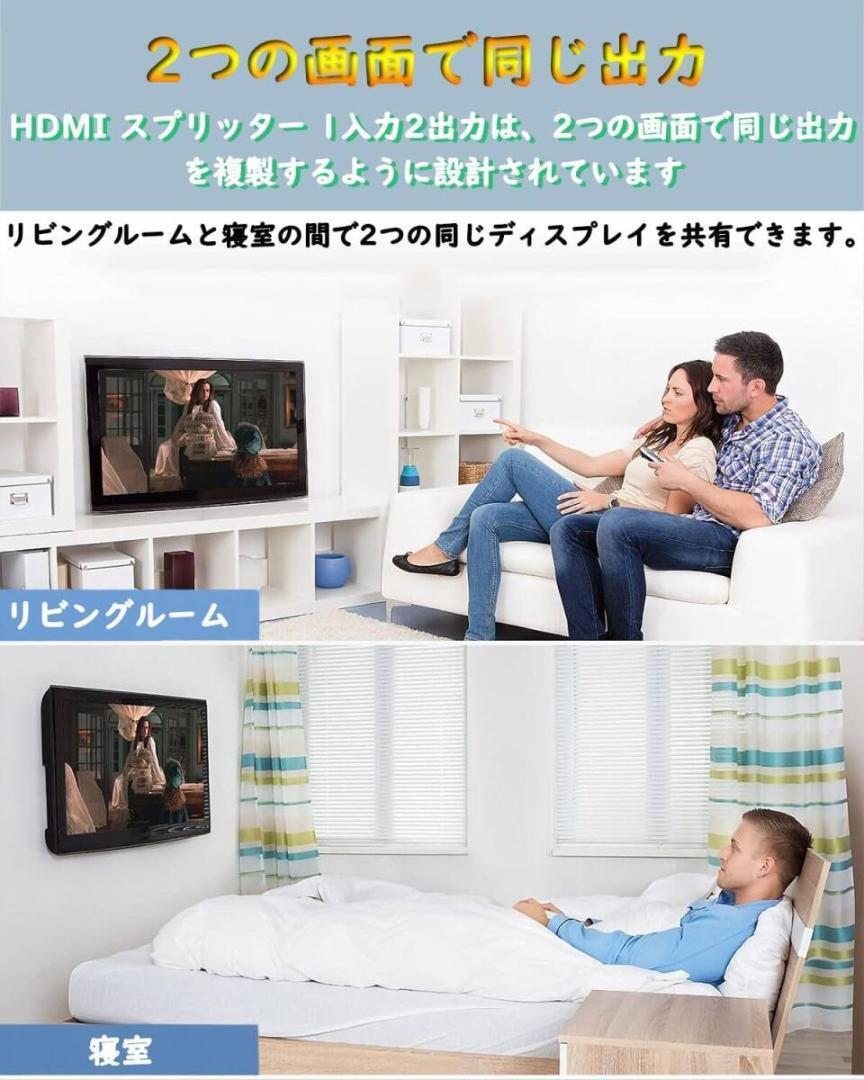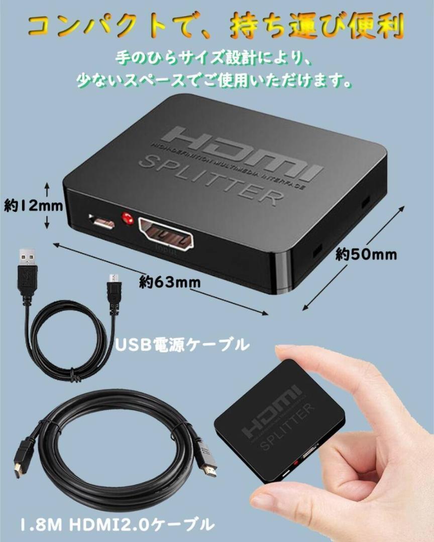 Yasoku HDMI 分配器 1入力2出力 二股 お好みの2台のディスプレイに同時出力可能 スプリッター て複数画面出力可能 hdmi 増設 オーディオ同期 PS5/Xbox/HDTV/DVD/PC/fire tv stick/PC/HDTVなど幅広く対応(高速1.5Mの2.0HDMIケーブル&USB電源ケーブル付き) 【HDMI 分配器 同時出力】HDMI スプリッター 1入力2出力は、2つの画面で同じ出力を複製するように設計されています- HDMI スプリッター 2画面同時出力 あなたはビデオとオーディオを同時に、損失なしで、遅れなしで得るでしょう。【複製するだけで、2つの異なる出力は提供されません】 【HDMI分配器 4k】HDMI入力、出力が4K、HDMIケーブルが高品質の場合、両方のモニターがすべて4Kで動作します。HDMI スプリッター 1入力2出力は、4k@60Hz をサポートし、2k/1080p と下位互換性があります。遅延なし、画質や音質の低下なし。(インターフェースを挿入しても信号がないと表示される場合は、モニターの解像度を調整してください。) 【入/出力機器の互換性】HDMI分配器 拡張モード対応 サポート入力: コンピューター、パソコン/PC、MacBook、メディアボックス、PS5、pro、PS4、Switch、XBox、Fire TV、ROKU、Blu-Ray DVD プレーヤーなど。出:HD或全HD TV、器、投影机等。このHDMI二股分配器はほとんどのデバイスと互換性があります。 【プラグアンドプレイ接続簡単】サイズ:63mm*48mm*14mm 小さなHDMIスプリッター1入力2出力は外部ドライバーが不要で使いやすく、持ち運びが簡単で、旅行に便利です。 【包装内容】① 1 x HDMI 分配器 1入力2出力 ② 1 x HDMI ケーブル (1M)③ 1 x 電源ケーブル (USB 電源アダプターは含むない)④ 1 x 取扱説明書。 >