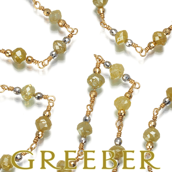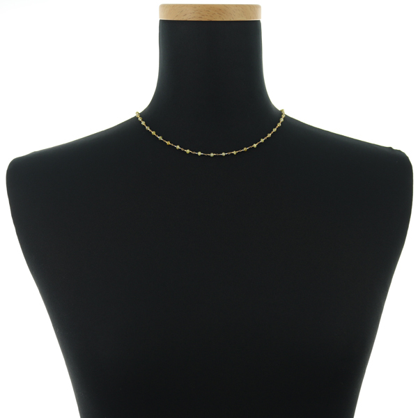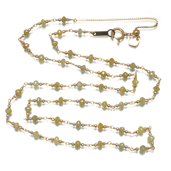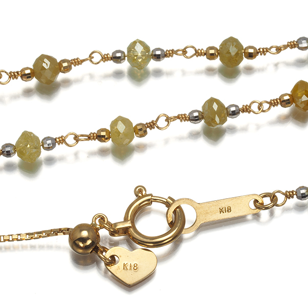 眩いテリを披露する多面カットのイエローダイヤモンドとカットボールパーツと共に並べた美しいネックレス。煌びやかで上品な雰囲気が胸元を演出します。 |