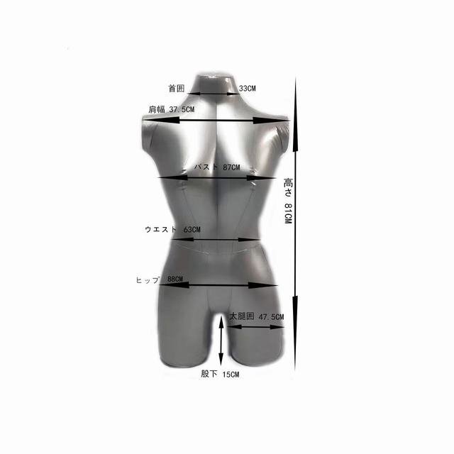 ●各部位のサイズは最後の写真をご参照ください。空気入れの多少で調節可能です。 ●PVCエアーマネキンシルバー。空気抜けを防ぐ逆流防止弁付。 ●ハンガーフックを引っ掛け、簡単ディスプレイ。 ●魅力的なディスプレイで、他の出品者と差をつけることができます。 オークションに出品する際に使用しても、お洋服が引き立ちます。オシャレな演出にこだわりたい方には、必需品とも言えるでしょう。 ●商品棚の上や、ちょっとした隙間など、物足りなさを感じるところに使用すれば、たちまち空間が華やかになります。 ●ワンランク上の演出をしたい時にも、大活躍のスグレモノです。ご自宅用として、縫製の出来ばえのチェックや、大切な衣装の保管等にお使いいただいても便利です。 ●お気に入りのコスプレ用衣装などを飾って、お部屋のインテリアとして使用するのもオシャレです。 ●海外輸入品です。汚れや傷がある場合がございますので,気になる方のご購入はご遠慮ください。