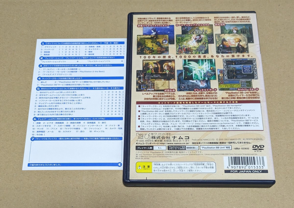 【PS2】 ヴィーナス&ブレイブス ~魔女と女神と滅びの予言~ ブランド:バンダイナムコエンターテインメント 発売日:2003/02/13 本商品について。 【商品状態】 ランク【B】 下記情報をご参照下さい。 【S】新品未開封のもの 【A】中古だが状態の良いもの 【B】平均的なコンディションの中古品、使用感や細かな傷あり。 【C】目に見えての明確な傷や汚れ等がある 【D】動作不良品等 上記はあくまで個人主観による判断となりますので多少の差はある可能性がございます。また、取扱品はあくまで中古品となりますのでご理解ご了承の程お願い致します。 【動作確認状況】 初期動作確認済みです。 他サイトと併合出品しており取扱数が多いため基本的に簡易的な初期動作確認しか行っておりません。予めご了承下さい。 【付属物】 基本的に写真に記載しているものが全てです。 プロダクトコードの類は特に記載のないものは使用済みであることを前提にお考え下さい。 【返品保証あり】 万が一動作不良や記載しているコンディションと大幅に異なる、その他不備等あった場合には【受取通知&評価前】にご連絡下さい。 返品、交換等対応させて頂きます。 万が一事前相談なしにいきなりの低評価を受けた場合は今後のお取引をご遠慮させて頂きます。また、場合によってはこちらからも同様の評価にてお返しする場合もございます。ご了承の上お願い致します。 【発送について】 お支払い確認から48時間以内需在賣家要求時間完成匯款 の発送となります。 即日に発送できる場合もあればギリギリになる場合もございます。予めご了承下さい。 【落札後について】 こちらからの初回連絡は発送時となります。ご了承下さい。 【他商品との同梱値引きについて】 質問欄等よりお問い合わせ下さい。ご購入後でも可能な限り対応しますがサイズ次第では不可となる場合もございますのでご了承下さい。 【その他】 不明点、発送の希望日等ありましたらご購入前に質問にてお問い合わせ下さい。ご購入後では対応致しかねる場合がございます。 >