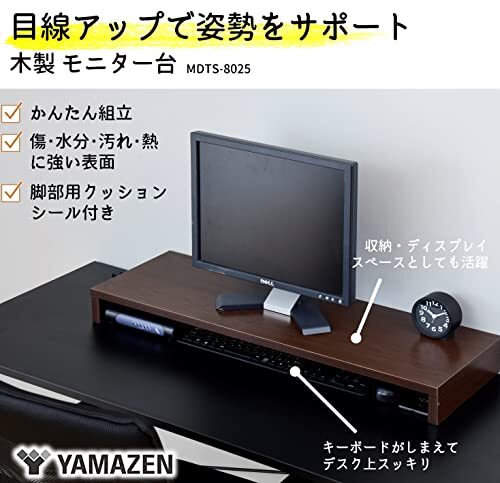 木製・ココアブラウン 6.幅80cm MDTS-8025(CCB)・・Size:6.幅80cmColor:ココアブラウン・本体サイズ:幅80×奥行25×高さ8cm・内寸:幅76×高さ6cm・耐荷重:15kg・材質:合成樹脂化粧パーティクルボード(メラミン樹脂=傷・汚れ・水分・熱に強い)・品質試験:国内の第三者機関において、JIS基準に基づいた試験に合格済み傷・汚れ・水分・熱に強い表面 山善「木製デスク上スタンド MDTS」 ●幅80cmのワイドサイズの机上台 ●表面はメラミン樹脂加工がほどこされているので、傷・汚れ・水分・熱に強く、よりキレイに長く使える ●机上台を使うことで目線がアップし、猫背を防ぐ ●台の下は収納スペースとして使えるので、小型のキーボードやメモ帳などの収納に便利 ●本体サイズ:幅80×奥行25×高さ8cm●※内寸:幅76×高さ6cm ●脚ウラはクッションシール付きで机を傷つけにくい ●耐荷重:15kgのしっかり設計 ●品質試験:国内の第三者機関において、JIS基準に基づいた試験に合格済み ●組立てカンタンですぐに使える