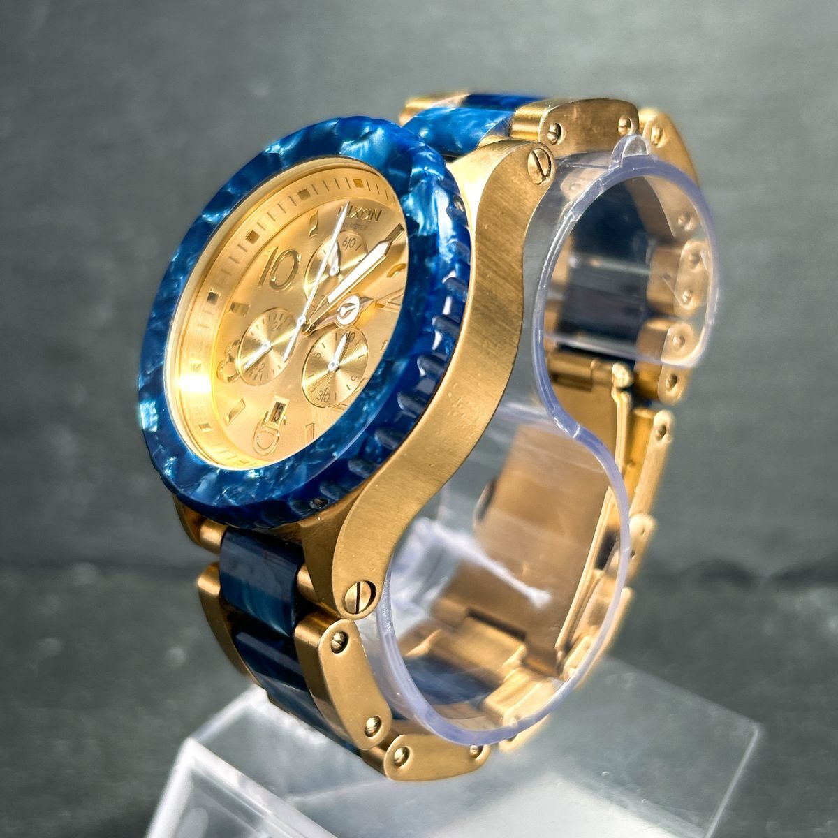 美品 NIXON ニクソン 42-20 CHRONO クロノ A037-1038 腕時計 クオーツ アナログ カレンダー ゴールド×ネイビー ステンレス 新品電池交換済