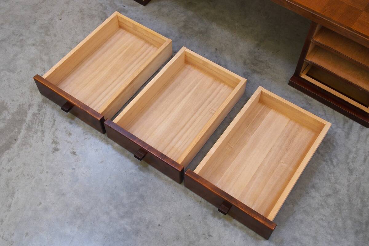 | この度は、ご覧いただきありがとうございます。 zyt2388ジ 昭和レトロ家具 文机 両袖机 市松模様天板 幅130cm 帳場机/座敷机/木製/寄木細工/チェッカー/デスク『仙台市 引取歓迎』70806-05 の投稿です。 ----------------------------------------------------------- 【お品物の詳細】 商品名:昭和レトロ家具 文机 両袖机 市松模様天板 製造元:不明 製造年:不明 サイズ:幅 130cm 奥行 60cm(取っ手除く) 高さ 34.8cm(タップ除く) ※すべて素人採寸/数ミリ程度の誤差はご容赦ください。 付属品:なし ※商品写真はテント倉庫内で撮影しております。テント幕を透過してくる太陽光の影響を受け、写真と実物とで色合いの異なる場合がございます。予めご了承ください。 ----------------------------------------------------------- 【お品物の外観状態】 外観状態ランク:A... 目立った傷・汚れが余り感じられない程度の美品のお品物 ****************************************** ▼注意事項御座います、必ずお読みください▼ ****************************************** こちらのお品物は当方がお譲り頂いたお品物となります。 前所有者の方の購入時期や使用場所、使用頻度等は不明なお品物となります。 市松模様の天板がひときわ目を引く素敵なお品物でございます。 外観状態と致しまして、大きく目立った傷や汚れのお見受けできない中古のお品物かと思われます。 尚、向かって左側の天板エッジ部に細かな傷がお見受けでき、向かって右側の引き出し中段の前板側面にスレと、続く本体側板に小欠けがございます。 経年中古のお品物となりますので、基本的に僅かな傷や汚れなど、多少の使用感や各種経年劣化はあるものとお考え下さい。 経年等を考慮致しますと当方主観では中古美品のお品物と判断致しております。 当方でも簡易的な清掃は致しましたが、細部の清掃やメンテナンス、消耗品の手配等につきましては落札者様にてお願い致します。 当方家具などの専門ではない為、見落としや写真に写し切れていない箇所等のある場合がございます。 ご不明な点がございましたら質問にてお問い合わせください。尚、専門的な質問にはお答え致しかねます。 現状のお品物として出品させていただきますので、画像で判断できる方、ご理解ご了承いただける方の入札をお願い致します。 ★状態ランク★ N...新品・未使用・未開封品のお品物 S...数回使用した程度の美品のお品物 A... 目立った傷・汚れが余り感じられない程度の美品のお品物 B...一般的な使用感があり、細かな傷や汚れがあるお品物 C... 傷・汚れが目立つ状態のお品物 J... 故障・破損・破け等がある商品(ジャンク品) ※長期の保管や倉庫内での移動等により、コンディションに多少変化のある場合がございます。大変恐れ入りますが、何卒ご理解賜りますようお願い申し上げます。 ******************************************************************* 【発送方法・送料等】 ①『家財おまかせ便(電話番号必須)※旧ヤマトらくらく家財便』 ②『仙台市内(当方倉庫)でのお渡し』 ※配送料金が高額となりますので、当方では引き取り(当方倉庫での直接の引き渡し)を推奨しております。 - - - - - - - - - - - - - - - - - - - - - - - ①『家財おまかせ便(電話番号必須)※旧ヤマトらくらく家財便』 アートセッティングデリバリー株式会社の『家財おまかせ便』にて 【 Cランク(三辺合計250cmまで)】のサイズで発送させて頂きます。 ※集荷予約の際、お届け先の電話番号が必要となりますので、落札後、取引ナビにて電話番号をお知らせください。 [送料例] 宮城県→宮城県 7,740円 宮城県→東京都 8,490円 宮城県→大阪府 10,750円 宮城県→福岡県 14,540円 ※上記の例は2025年1月時点での金額となります。詳細は家財おまかせ便のサイトにてご確認ください。 上記以外の地域の詳しい送料につきましては、下記リンクをご確認ください。 ◆家財おまかせ便 料金検索◆ ※家財おまかせ便では、地域によって指定できる時間帯が異なります。対応可能地域でも加算料金が発生する場合がございます。なお、サービス不可のエリア、サイズ制限がございます。 【 家財おまかせ便 - 配送日時・対応エリア 】 ※大型のお品物の為、お届けまでに非常に日数を要することが予想されます。 ※家財おまかせ便の場合、ドライバーの判断により急遽集荷出来ない物と判断される場合も御座います。 ※商品に破損や故障があった場合、こちらに返送を行う場合は送料はご負担して頂く場合が御座いますので予めご了承ください。 ※到着後、梱包の確認(破れやヘコミが無いか)、本体外観の確認、通電動作の確認をお願い致します。 目立つような傷や破損があった場合、梱包材は捨てずそのまま保管した上で、当方へご一報をお願い致します。 ご連絡無く返送やその他ご対応をされた場合、当方では一切のご対応は出来かねますのでご注意ください。 - - - - - - - - - - - - - - - - - - - - - - - ②『 仙台市内での直接のお渡し 』 当方倉庫(仙台市宮城野区中野 ※仙台港ICより車で1分)での直接のお渡し。 事前に