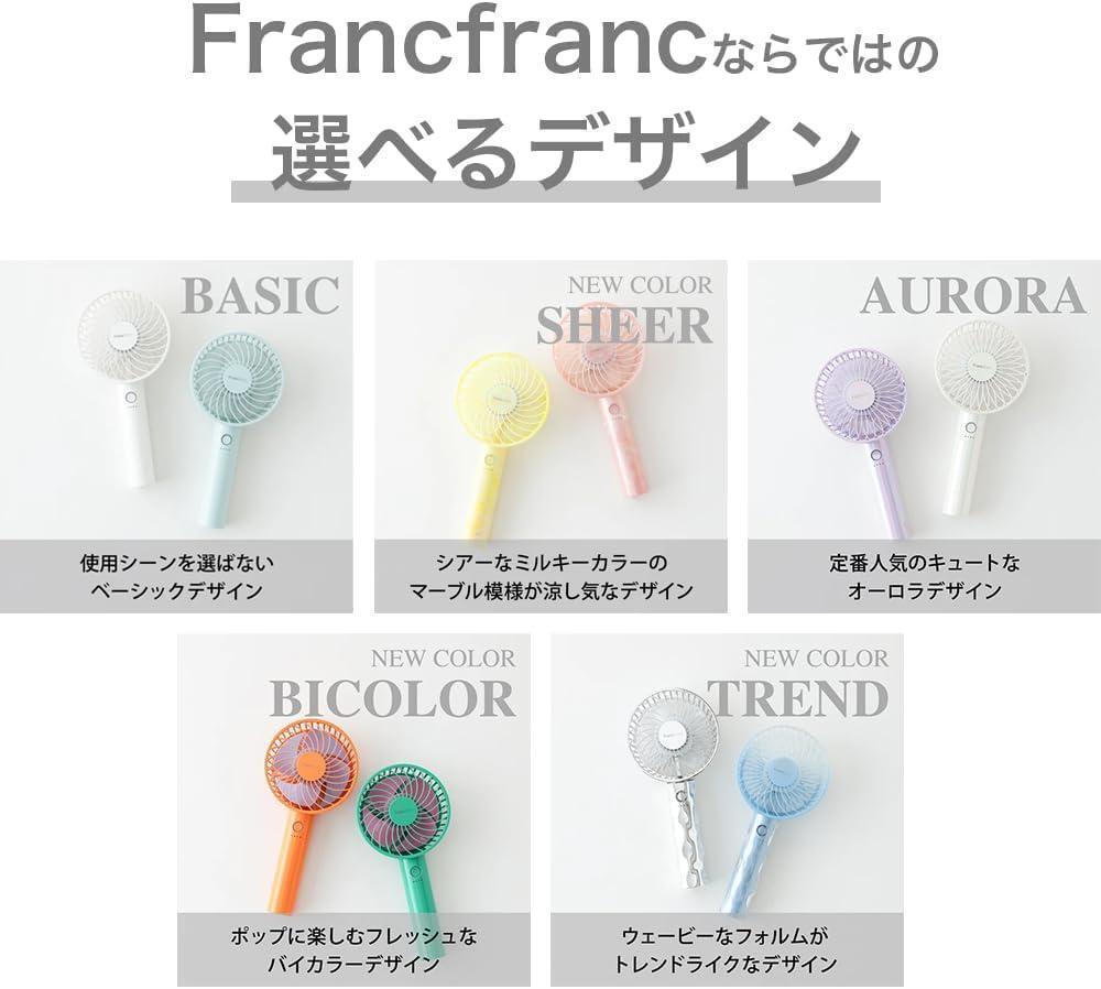 ご覧いただきありがとうございます ★取り扱い商品について★ アウトレット商品を多数取り扱っております 新品未開封品 開封済み未使用品 訳あり新品(外箱や本体に多少の傷・汚れがある場合) 動作確認済みの中古品 本商品は検品のため一度開封している場合があります 外箱や本体に傷・汚れがあることもございます 検品はしておりますが見落としがある場合もございます 中古品にご理解ある方のみご購入をお願いいたします 【メーカー】Francfranc フランフラン フレ ハンディファン 【参考価格】¥2,680 【コンディション 】新品未使用 動作チェック済み 箱に傷や汚れがございます 付属品などは全て完備 【カラー】ミント 映り具合などでの多少の違いはご了承ください パワフルな風量と静音設計で、どこでも涼しく快適。 ファッションに合わせて選べる豊富なカラーで、毎日の持ち歩きもおしゃれに。 2025年モデルはスイッチ長押し仕様で、バッグに入れても誤作動を防止。 風量は5段階+リズム風で、手軽に調整でき熱中症対策にも最適です。 USB電源と充電池の2電源対応で、専用スタンドやUSBポートから充電可能。 満充電なら最大風力で約2時間、微弱風なら約9時間連続使用できます。 ストラップ付きで首掛けもOK。軽量180gで持ち運びもラクラク。 付属品:専用スタンド、USBケーブル、ハンドストラップ。★ 注意事項 ★