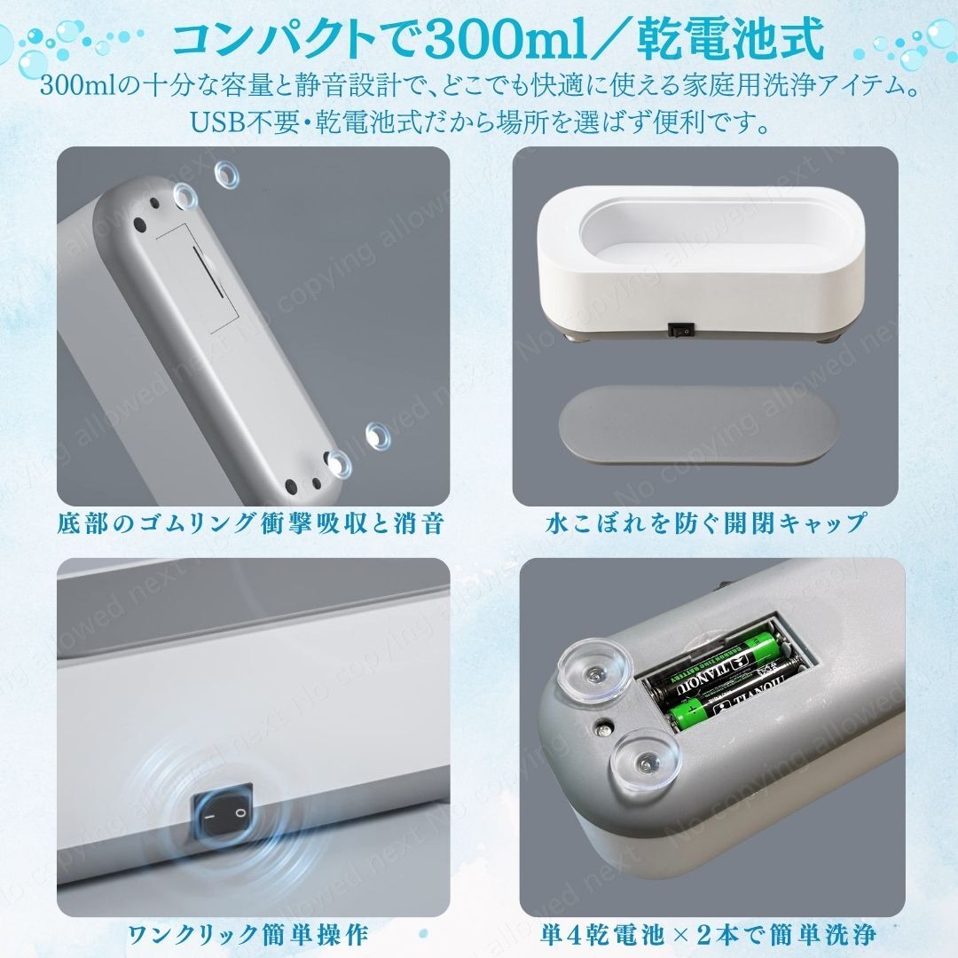 ・300mlの十分な容量と静音設計で、どこでも快適に使える家庭用洗浄アイテム。