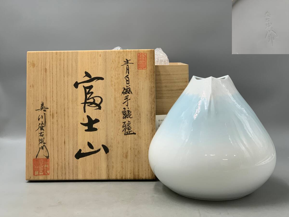 | 商品名稱 : | 10#E/B150 有田焼名人 奥川俊右衛門 青白磁『富士山』 青白磁手轆轤 壷 花瓶 花器 共箱 80サイズ |