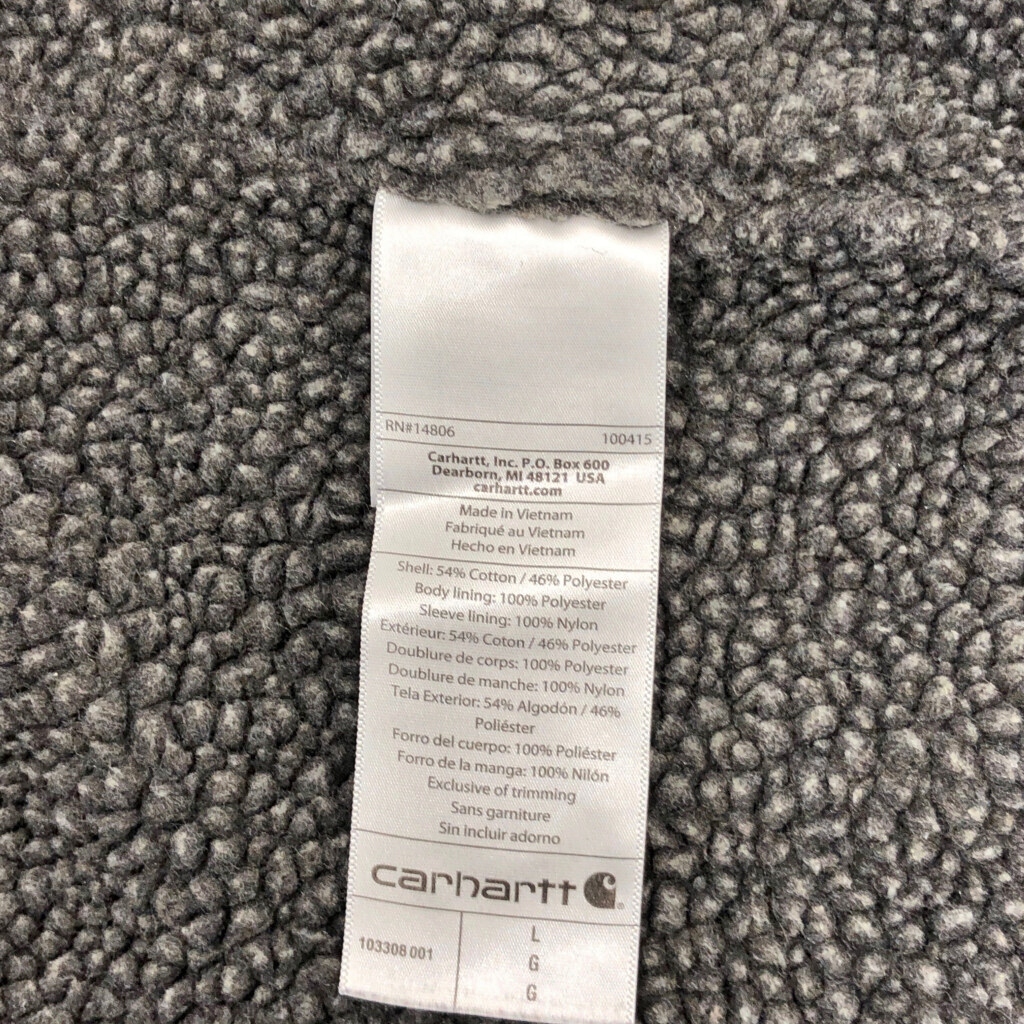 | 【商品管理番号】 V6900 【ブランド】 Carhartt/カーハート 【サイズ】 L 【実寸サイズ】 肩幅:約57cm 着丈:約66cm 身幅:約66cm 袖丈:約65cm 【主な素材】 表地 : コットン 【色】 ブラック 【仕様】 フルジップ フードドローコード、裏地ボア 【状態】 特記事項:色褪せ、毛玉、毛羽立ち | |||