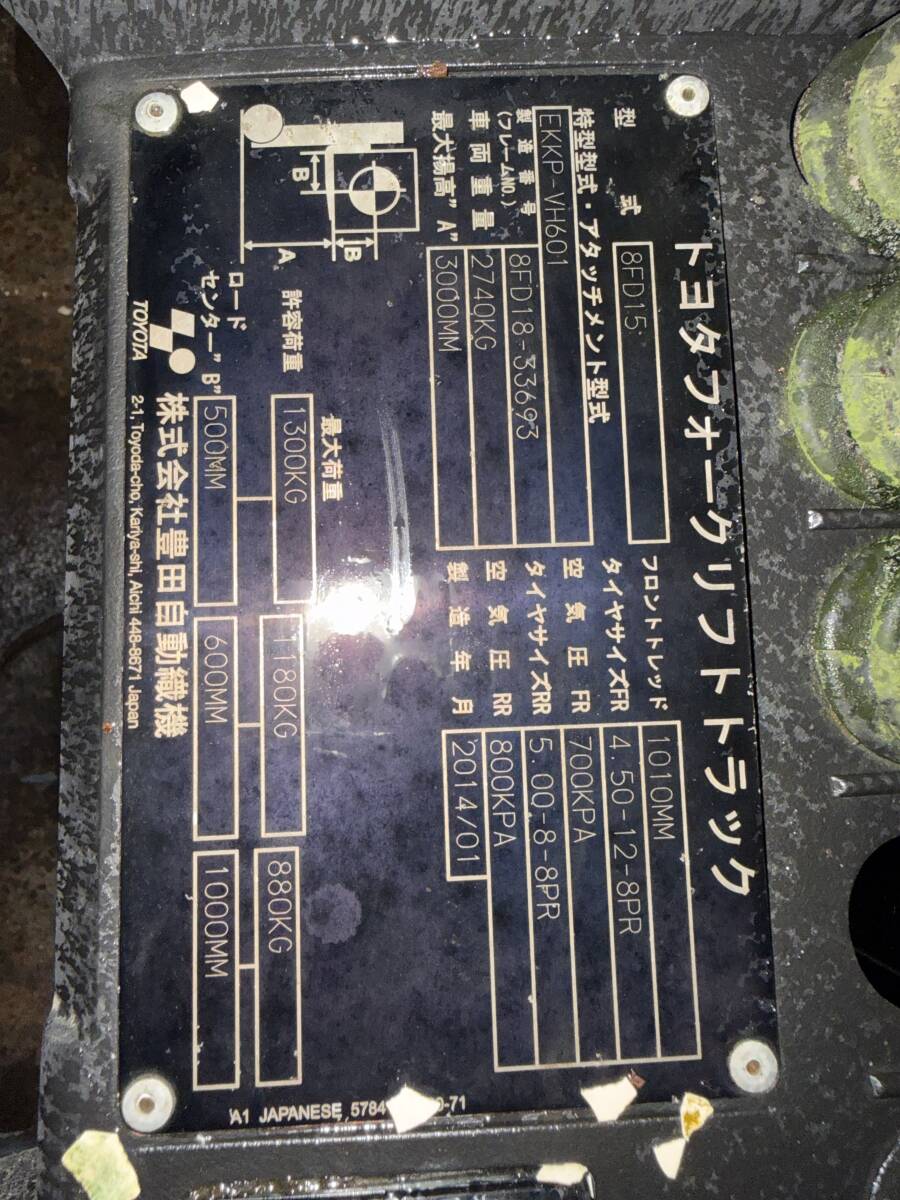 (2014年 ) 平成26年 トヨタ ディーゼル フォークリフト 8FD15 エンジン始動可・走行不可/修理・部品取り用
