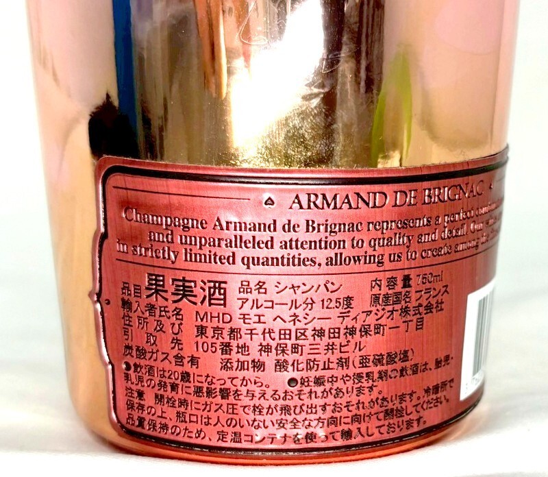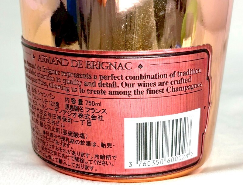 銘柄【ロゼ ARMAND DE BRIGNAC BRUT ROSE アルマンド ブリニャック ブリュット ローズ】 内容量/750ml 度数/12.5% 重量/1680g 状態/擦れ有、一部塗装剥げ有 付属品/なし