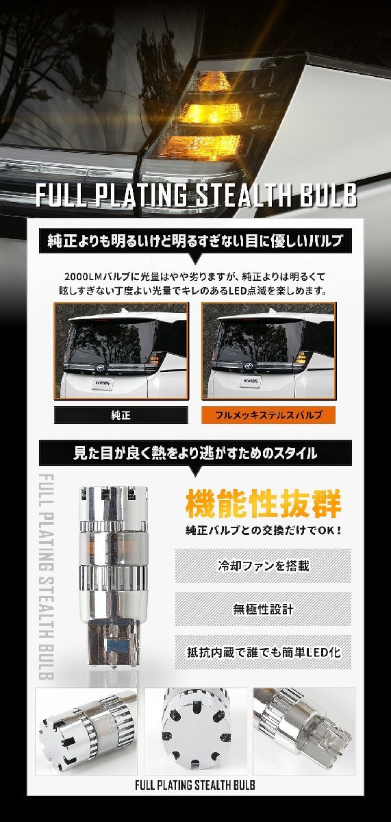 バルブボディをリフレクター内に馴染みやすいフルメッキにすることで純正のアンバー色が見える外貌を改善しました! 本製品にはLEDチップカバーにもメッキ塗装を施す事によりフルメッキで完全ステルス化を実現! 純正は非点灯時にレンズ内にオレンジ色が映り込み、せっかくのクリアレンズが台無しに… LEDバルブは、非点灯時の余計な映り込みも無く、すっきりシャープなライト回りになり、ファッション性も格段にアップします! 明るさは、2000LMの爆光バルブにはやや劣りますが純正よりも明るく、抵抗内蔵タイプなのでポン付けでキレのあるLEDの点滅を楽しめます。