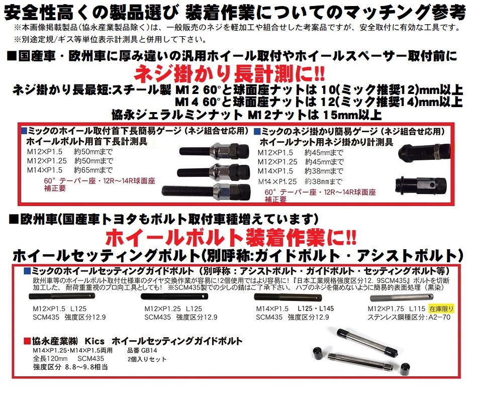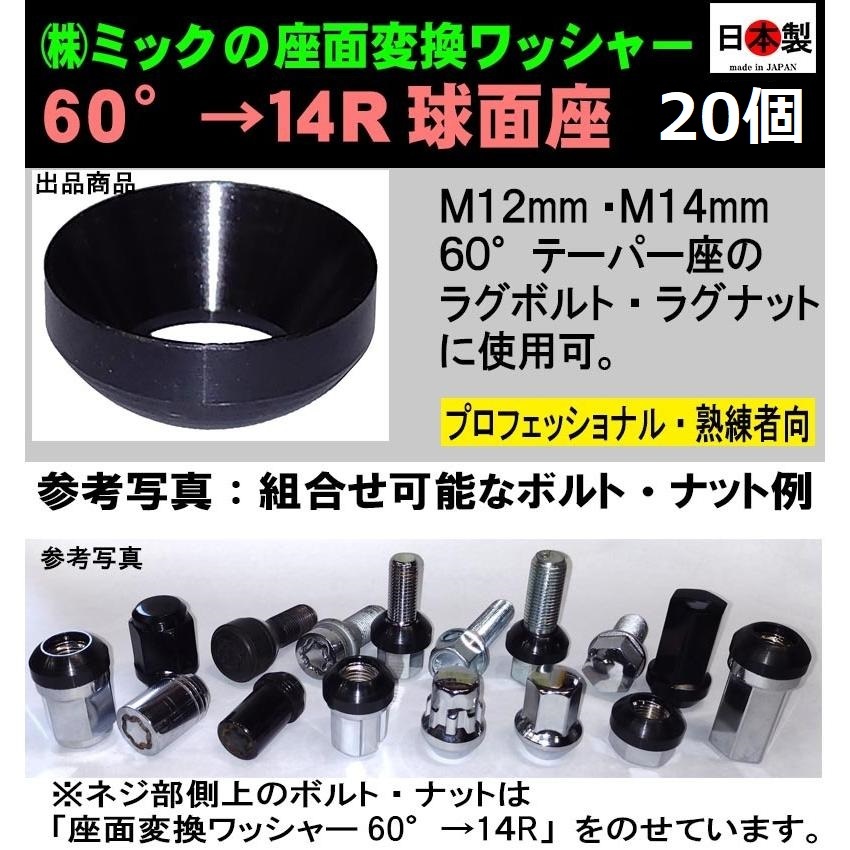 特殊パーツ(プロフェッショナル・熟練者専用)に属する製品です。 1枚目参考写真 60°テーパー座のラグボルト・ラグナット(ロックボルト・ロックボルト)と組み合わせて 14R球面座に変更します。 対象ホイール:14R球面座仕様のホイール:メルセデスベンツ・ポルシェ・レクサスis(2021年)等他 ■全長:10mm(長めの全長は走行破損時の脱落防止効果と取付作業センターだし精度高い) ■60° テーパー最広部直径:23.5mm(精度良く広座面端近く迄有効な広い座面あたりは、高締付トルクに対し面圧低く、ゆるみ防止効果・破損防止効果) ■60°テーパー最小直径:13.9mm ■ 外直径:25mm(精度良く広座面端近く迄有効な広い球面座面あたりは、高締付トルクに対し面圧低く、ゆるみ防止効果・破損防止効果) ■ 重さ:12g ■ スチール(SUM23L)鋼(鋳造製品より密度高く粘りある高強度) ■ 表面:六価黒色亜鉛メッキ ■製造:日本製(切削精度高く広い座面は安全と作業性重視) ※2枚目参考写真:組合せ使用時(協永産業社の標準的なスチール製60°テーパー座ラグボルト・ラグナット)例 M12mmナットでは初期ネジ掛かりがナットのみの通常より2~2.5mm位奥(ワッシャー先端より初期ネジ掛かりまで3~3.5mm位)になります。M14mmナットでは4mm位奥になります。 M12mmボルトでは首下長ほとんど変わりません。M14mmボルトでは首下1~1.5mm位短くなります。 2021年レクサスisの5穴P.C.D.114.3 14R球面座仕様ホイール(ボルト仕様) 5穴P.C.D.114.3の(ナット仕様車)他車種に取付ける場合に 等他応用組み合わせを可能とする部品です。 ※3枚目写真は「ミックの座面変換ワッシャーラインナップ」です。写真外ではシャンク付平面座ナット(ボルト)用の「ミックのシャンクカラー(シャンク径変換スリーブ)」もあります。 非常に薄いワッシャーなので60°テーパー形状(ボルト・ナット側)・球面14R形状(ホイール側)が合わない場合破損する場合も考えられますので、 対象物と、ナットの60°テーパー面や14R球面部の当製品との面あたりを確認してからのご使用をおすすめします。締付トルク14kgf・m以下の使用用途の場合におすすめします。インパクトレンチ等衝撃性ある取付は絶対にしないようにして下さい。手締め(手持ち工具)で、挟む本ワッシャーが、センターずれ無く装着できるように、丁寧な作業を推奨します。 詳しい説明や更新情報は(株)ミック公式ホームページ「ボルト・ナット座面変換ワッシャー」をご覧ください。 その他出品にてホイール用のボルト・ナット座面変換ワッシャー 60°→14R球面座・60°→13R球面座・ 60°→12R球面座や、ボルト径M12用平面座→60°テーパー座・平面座→12R球面座、M14mm用 平面座→60°テーパー座、平面座→14R球面座も発売中! | |