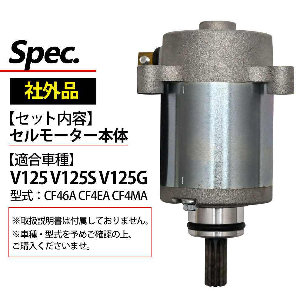 【商品説明】 セルモーターはエンジンを始動させるための大事なパーツです。 セルモーターが弱ってしまい、始動に困っている方にお勧めです。 交換補修品としていかがでしょうか。社外品商品無法判斷是否為正規品 【適合車種】 V125 V125S V125G 型式:CF46A CF4EA CF4MA ※適合は2025年5月現在のものです。モデルチェンジ等により適合に変更が生じる場合もございます。 【注意】 ※説明書は付属しておりません。 ※車種・型式をご確認の上ご購入くださいませ。 ※各パーツの色は入荷時期によって変わる場合がございます。