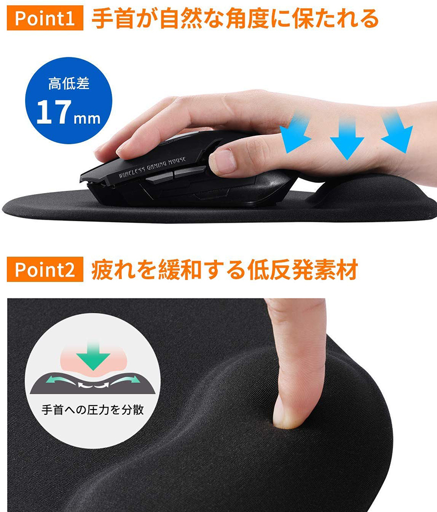 低反発なメモリーウレタンフォーム素材を採用し、円弧型のデザイン、完璧な手首のフィット感、触り心地がとても柔らかくて、手の肌に優しいです。