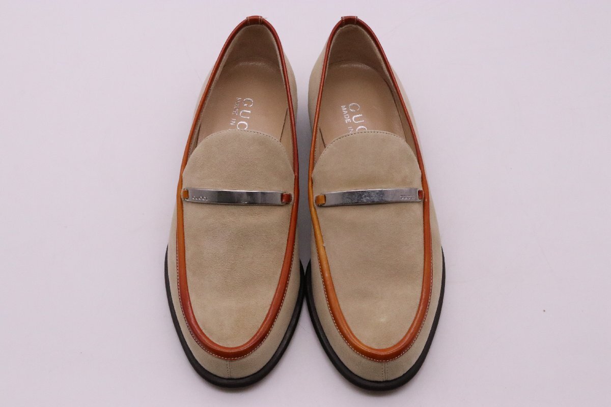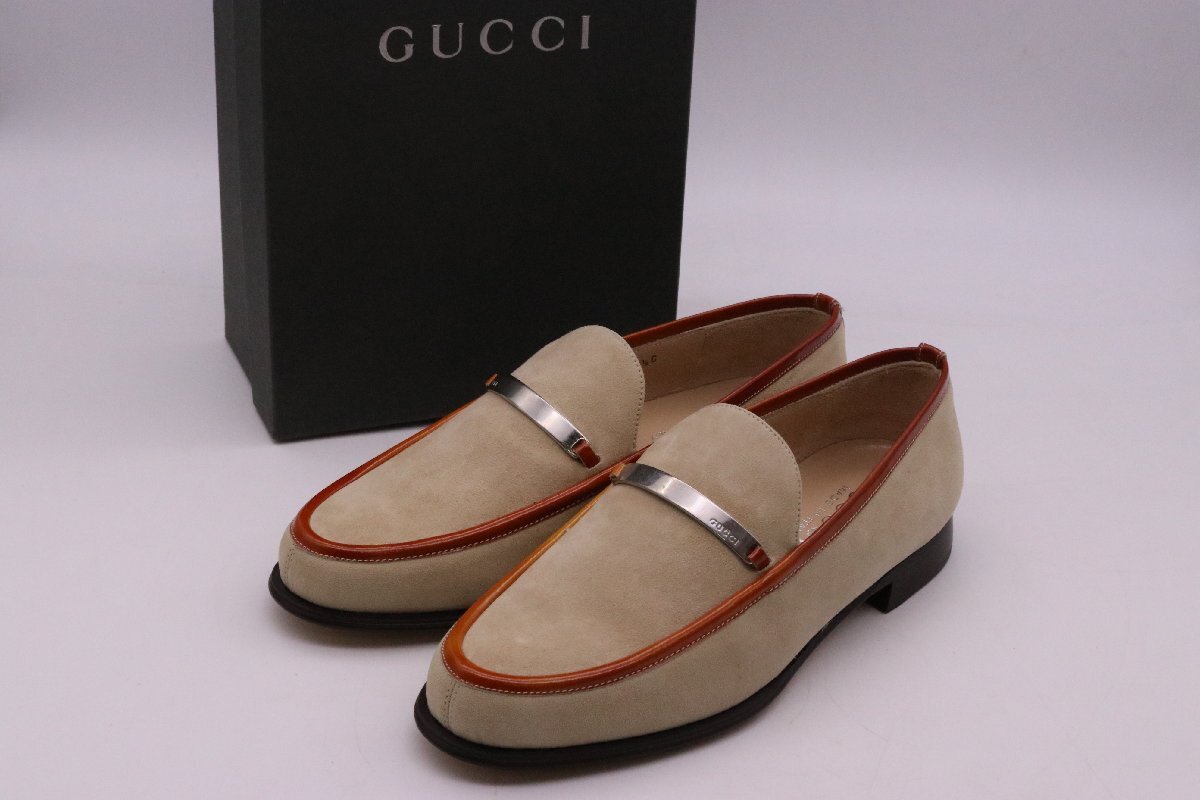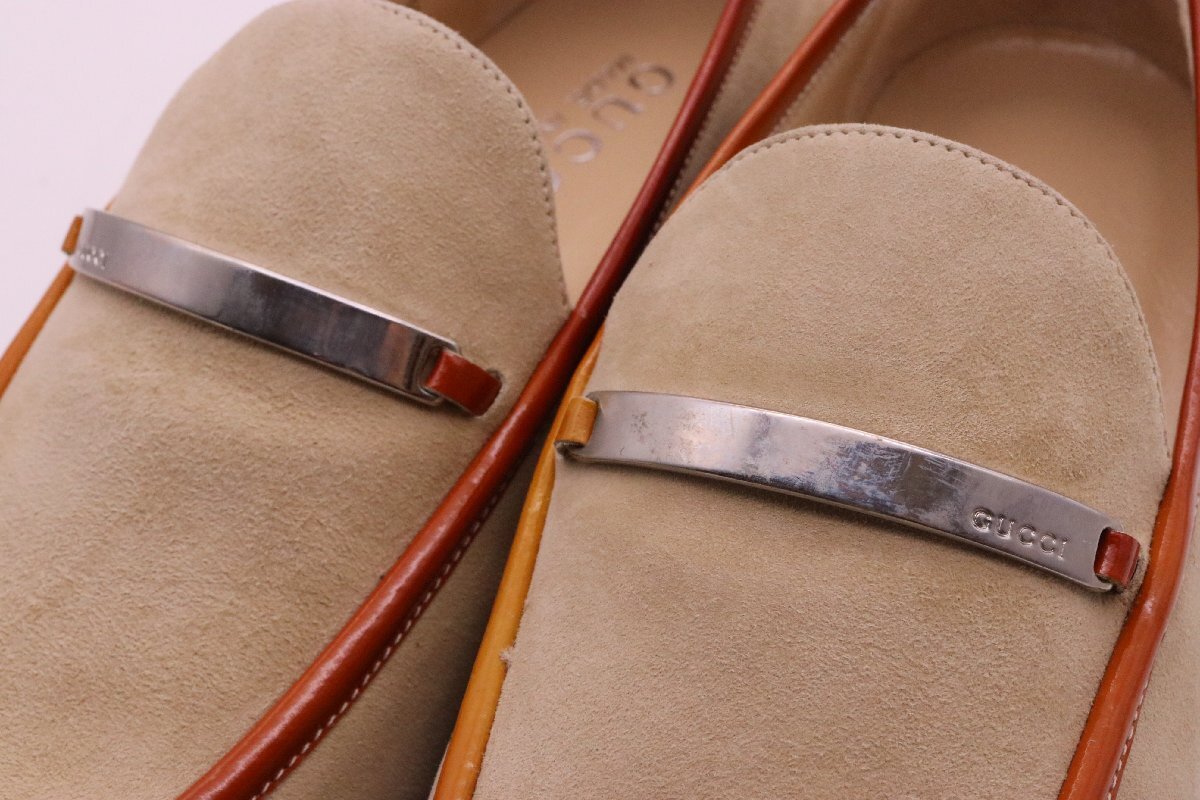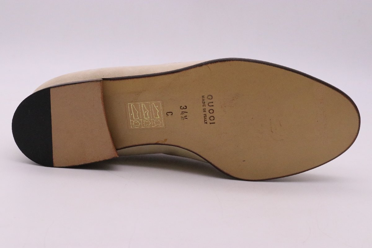 | GUCCI グッチ スエード レザー ローファー ロゴプレート付 ベージュ 茶 サイズ34 1/2 レディース 箱付き | ||