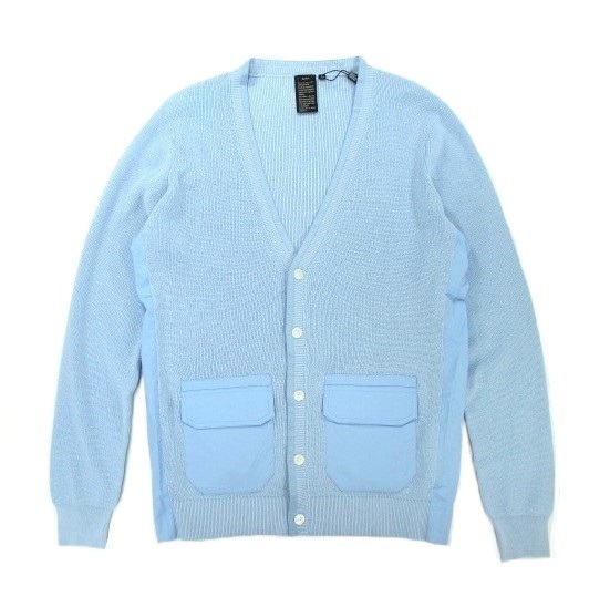 ポケットやサイドの部分にシャツ生地を組み合わせた、少し遊びのあるデザインのニットカーディガンです。
