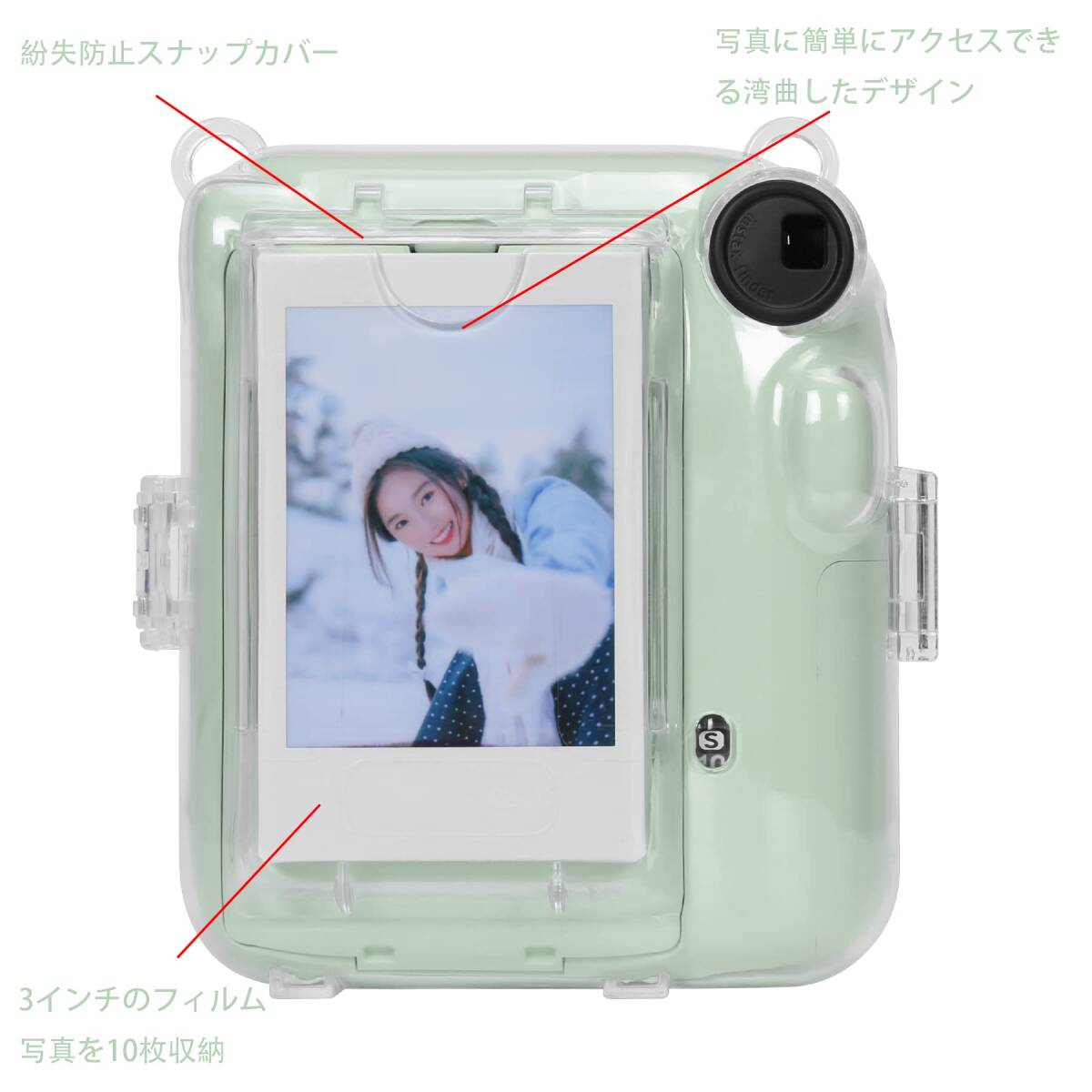 【硬質PVC素材】硬質PVCシェルは丈夫で軽量です。 透明なケーシングを通して、fujifilm instax mini 12カメラの本体が見え、カメラの自然な美しさとエレガントなテイストを示しています。