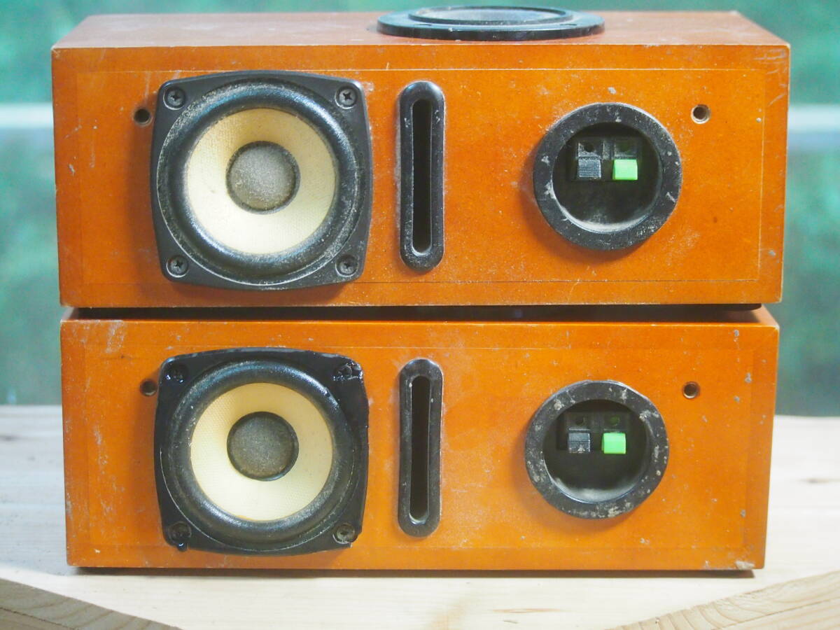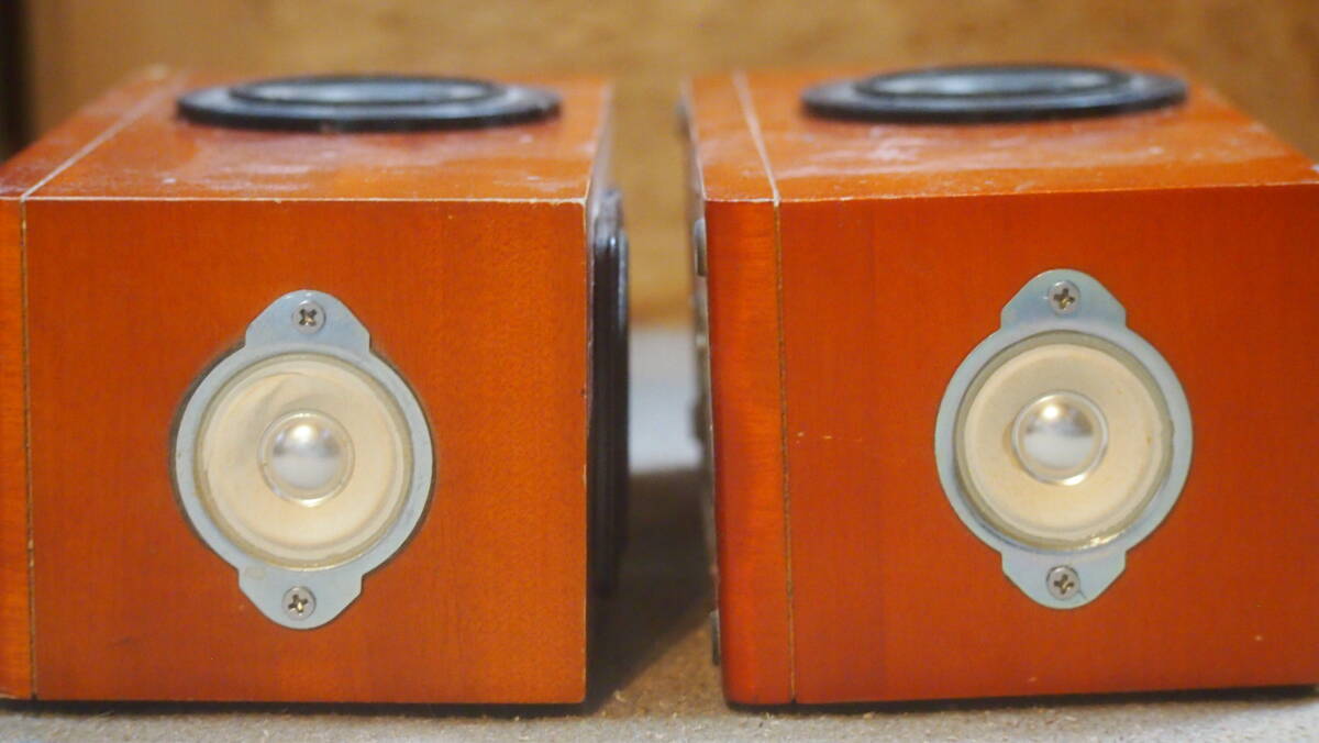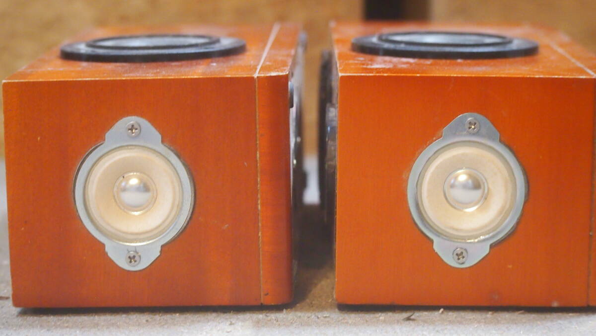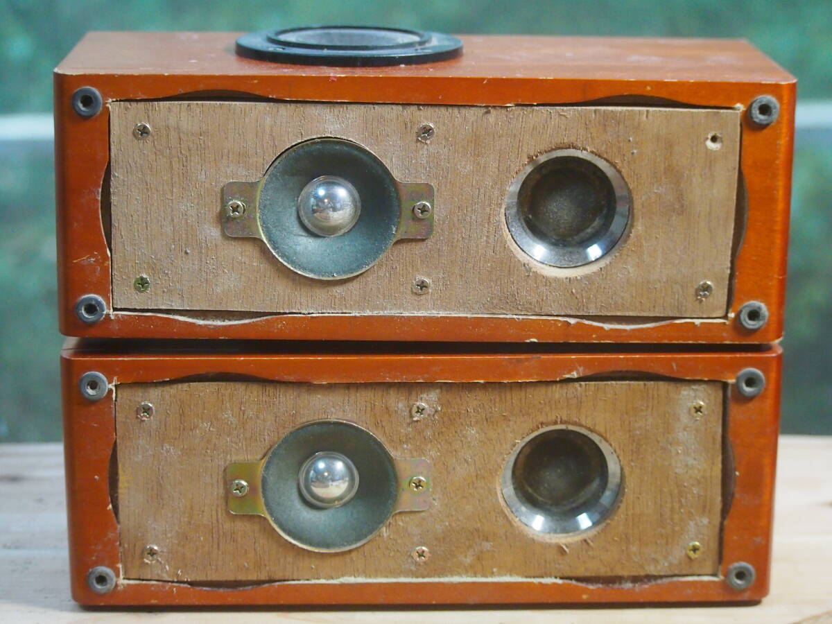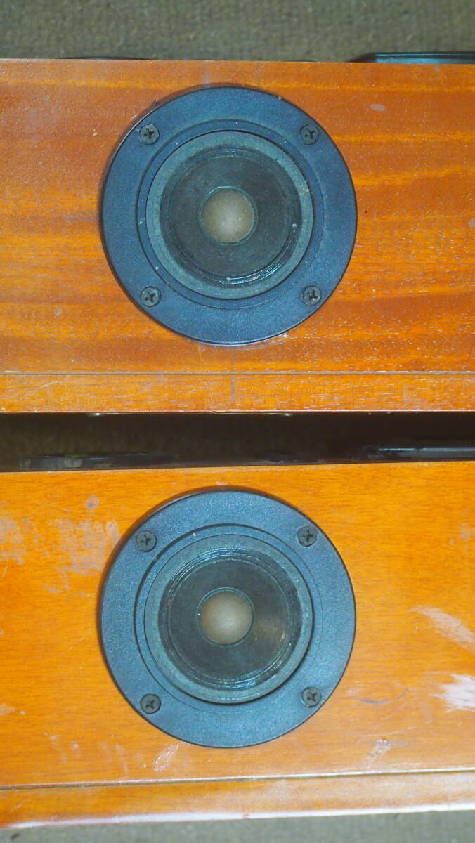 左右の35mmコーン・ツィーターはソニー製。コーン紙は紙製、センターキャップもは金属製、マグネットは径39mm厚さ6mmと径36mm厚さ6mmのダブル・フェライト・マグネット、インピーダンス8Ω、最大入力は不明です。 上面の5cmコーン・ツィーターはダイヤトーン製TW5040CM。コーン紙は紙製、センターキャップも紙製、マグネットは径50mm厚さ8mmのフェライト・マグネット、インピーダンス8Ω、最大入力は15Wです。 正面のソフトドーム・ツィーターはケンウッド製。ダイヤフラムは布製、マグネットは径60mm厚さ10mmと径50mm厚さ8mmの巨大ダブル・フェライト・マグネット、インピーダンス8Ω、最大入力は不明です。 背面の8cmフルレンジはSC‐A11から取り外したDENON製。コーン紙は紙製、センターキャップは布製、エッジは布製で劣化の心配はありません。マグネット部は径58mm厚さ25mmの防磁型、インピーダンス6Ω最大入力はシステム上100Wです。破損した樹脂製縁を修理してます。 フルレンジと正面のパイオニア製ピエゾ・ツィーターはスルー、ツィーターはシリーズ接続し、3.0μFを挟んで、クロスオーバー周波数は1171Hzです。
