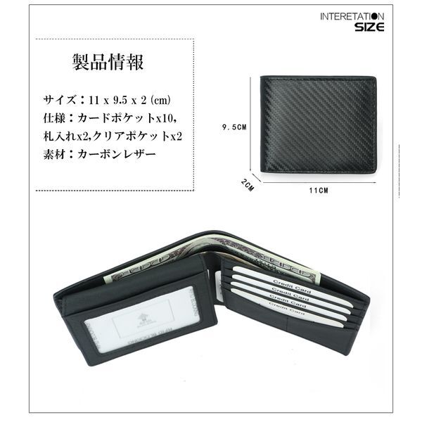 スペック - 製品詳細/Information - 【サイズ】:11cm x 9.5cm x 2cm 【素材】:カーボンレザー 【仕様】:カードポケットx10,お札入れx2,クリアポケットx2