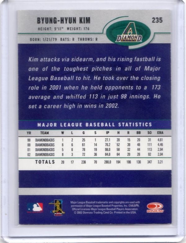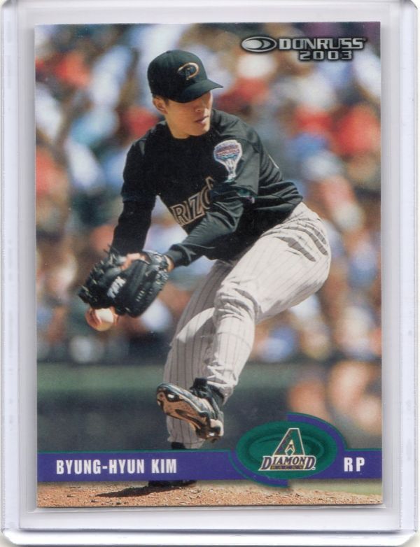 2002年発行 / 2003年版カード ------------------------------------------------------------- ■金炳賢 MLB成績 韓国出身 9年 1999-2007年 ダイヤモンドバックス レッドソックス ロッキーズ マーリンズ 394試合 54勝60敗86セーブ 841回 806奪三振 防御率4.42 オールスター1回 2002年 36セーブ(リーグ8位) キム・ファンの方、是非どうぞ! |
