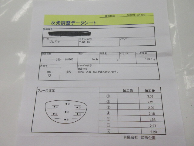 高反発加工ヘッド(データ表あり CT350) フェース面が湾曲してきています。 ヘッド重量:196.3g ウエイトプラグ:2g お知らせ 当店は不要なクラブの下取りも行っております。 落札いただいた後に届いた荷物が入っていた箱のクラブを入れ同封の書類とともに送り返して頂きましたら、 当店より査定価格を ご連絡させて頂きます。取引成立後、即日入金させて頂きます。 また、発送用箱をお持ちの方は先に下取りクラブをお送り頂きます(当店への送料着払い)と 差額のみの入金でご購入いただけます。 万が一、値段のつかないクラブの場合は処分も承っております。 買取りに関するお問い合わせはこちらから! 複数点、落札ご希望のお客様は、当店のヤフーショッピング店から購入いただきますと、送料1つ分で 一括決済いただけます。 ぜひ、ご利用ください。 ヤフオクからの場合は、「この出品者の他の商品とまとめて購入する」にチェックを 入れて落札いただけましたら、同梱発送させていただきます。よろしくお願いします。 商品ID:1155910 | |||