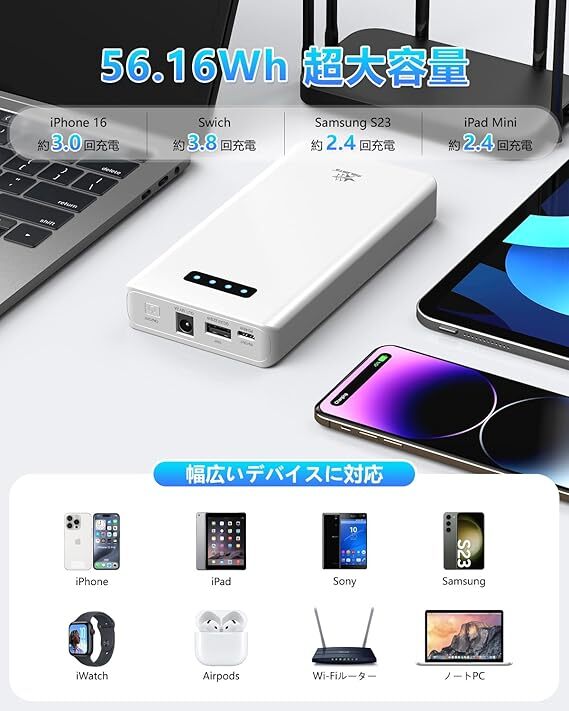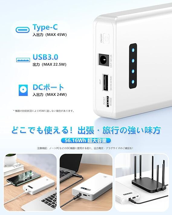 Amazon | Melasta モバイルバッテリー 【56Wh / 15000mAh・3WAY出力対応】USB-C 45W / USB-A 22.5W / DC 12V搭載 ルーター緊急バックアップ電源 急速充電&大容量 LED残量表示 PSE認証済 iPhone/Android/ルーター対応 停電・防災・旅行用