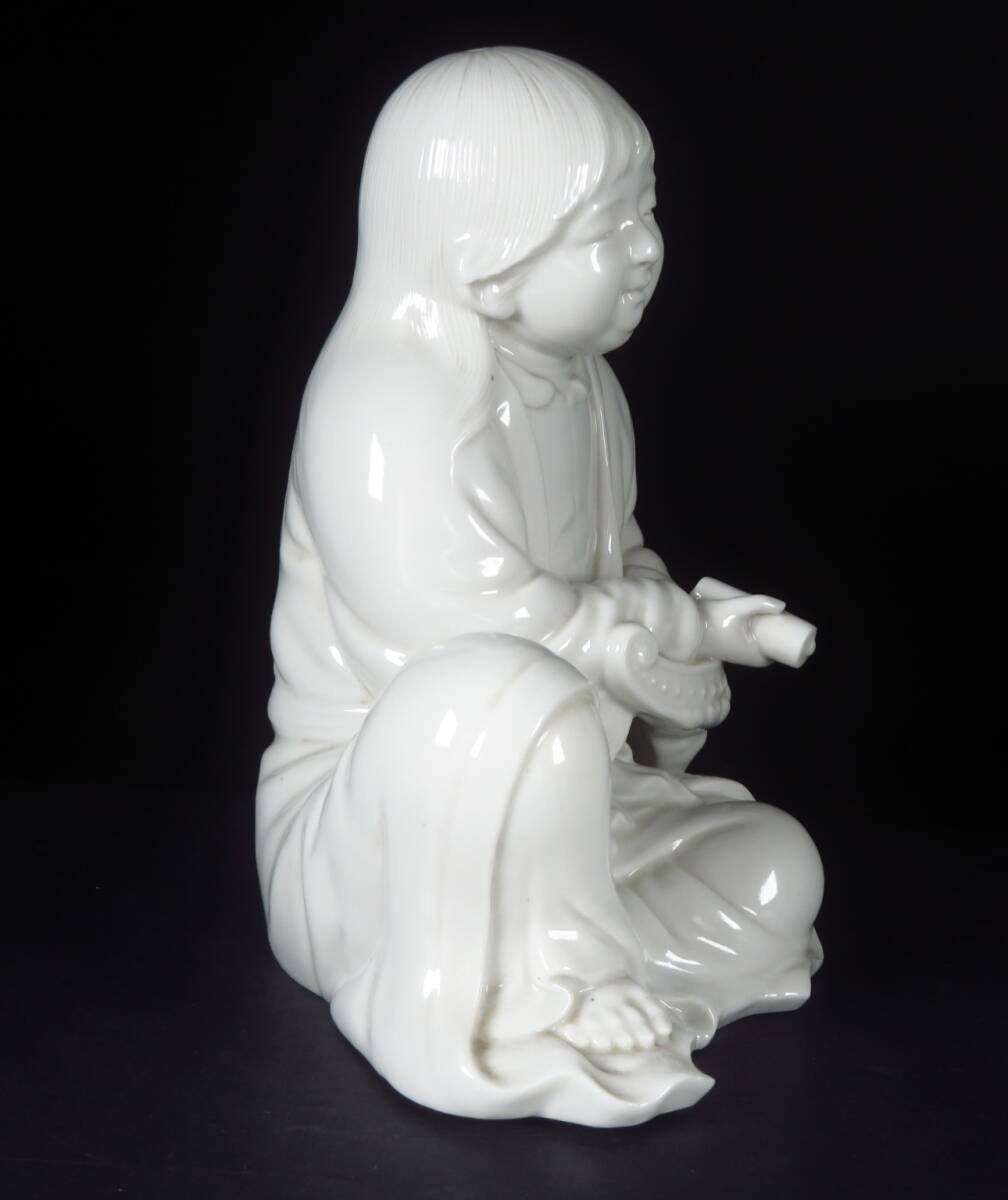 | 【SAKURAYA】最高峰美術磁器彫刻【白磁 菊慈童置物/工芸技術保存指定 二宮都水】細密彫刻 作家 在銘 共箱 骨董品 古美術品 希少品 高さ21cm | ||