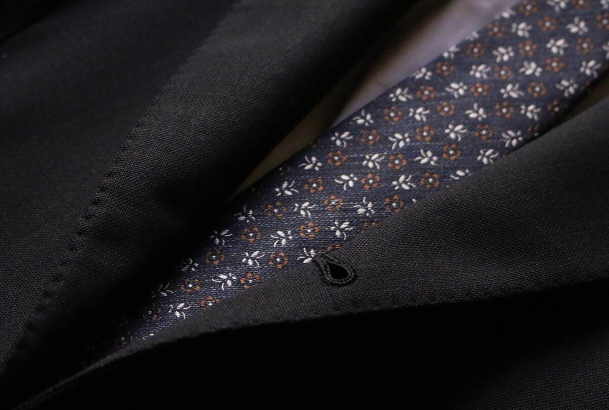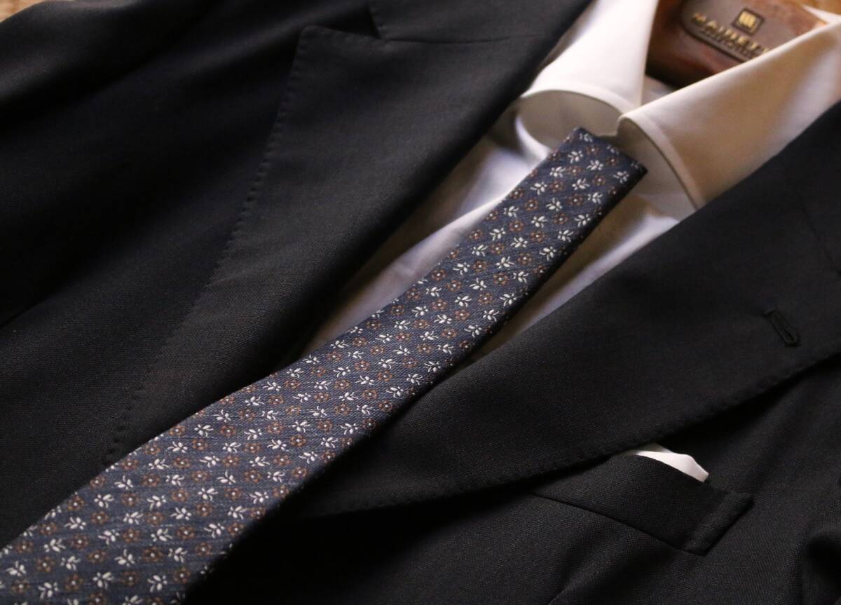 何本あっても困らない、使われている柄の種類や色が限られた、“ネクタイの基本アイテム”ネイビー小紋。ネイビースーツに鉄板なのは言わずもがな。加えてブラウンスーツでのアズーロエマローネのコーデで活躍してくれるほか、ブラックやグレースーツにも合わせやすく汎用性が高いため、コーディネートを考える時間がないときにも重宝してくれるかと思います。